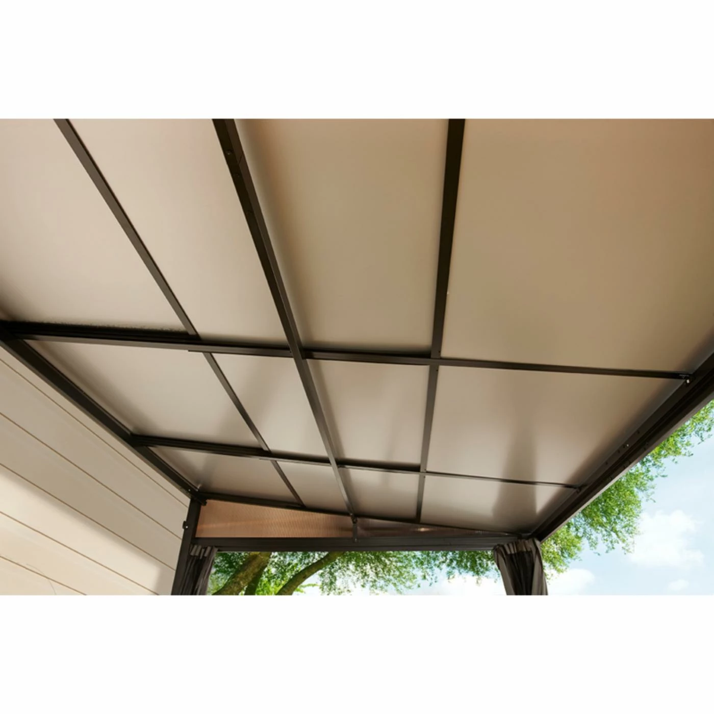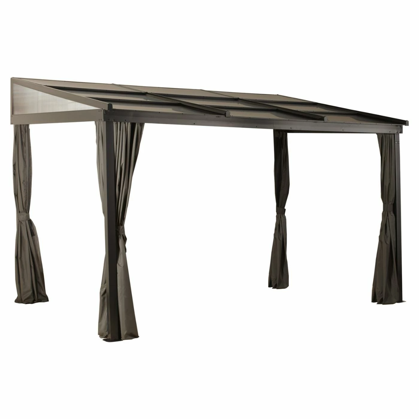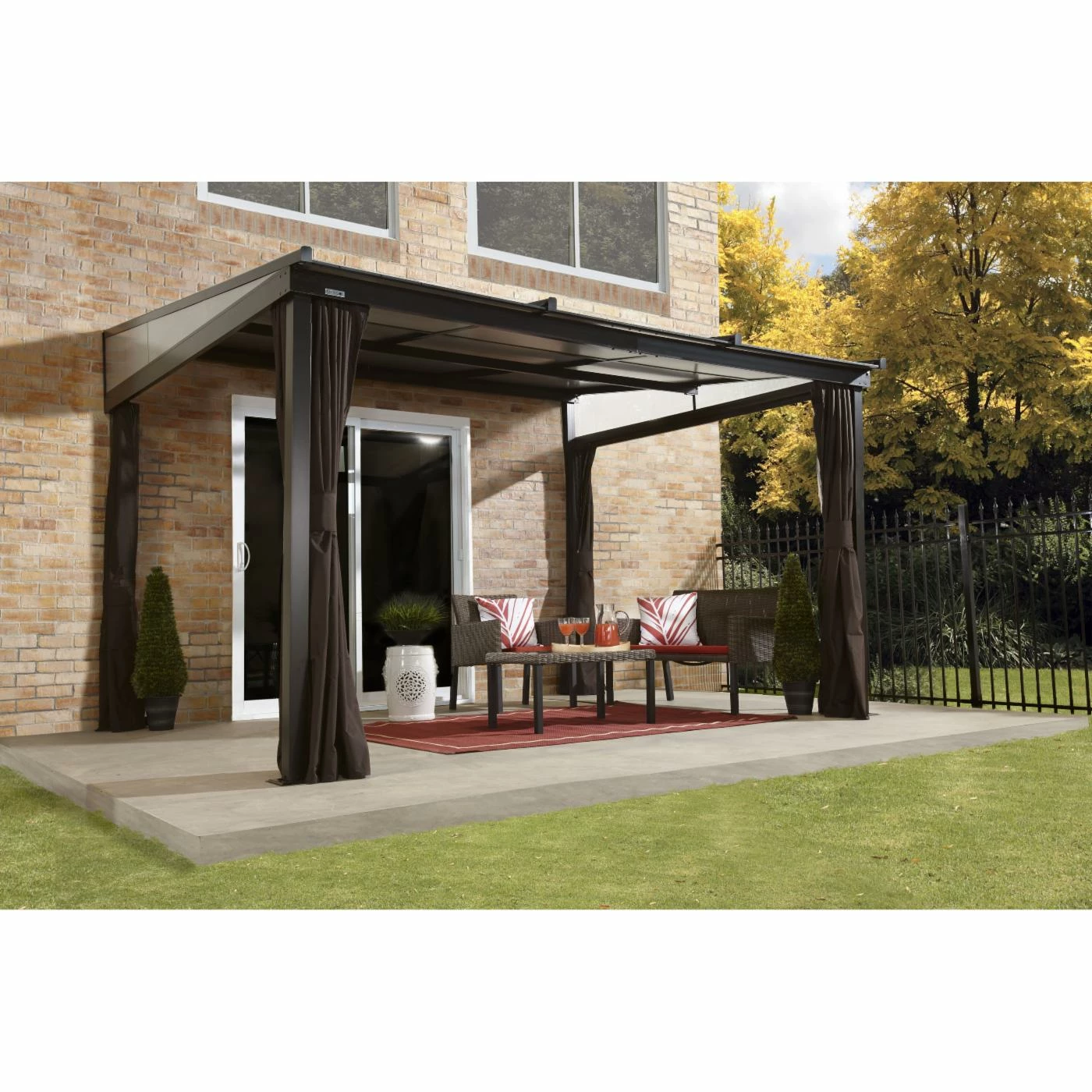 Step out onto your patio and under the shade of the SOJAG INC Budapest 10 x 12 ft. Wall Mounted Gazebo. This gazebo is durably constructed of powder-coated aluminum in a dark brown finish. The roof is made of retractable aluminum composite panels. The wall-mounted design will extend over your attached patio space and shelter your chat set. It includes a nylon mosquito cover and polyester privacy curtains.