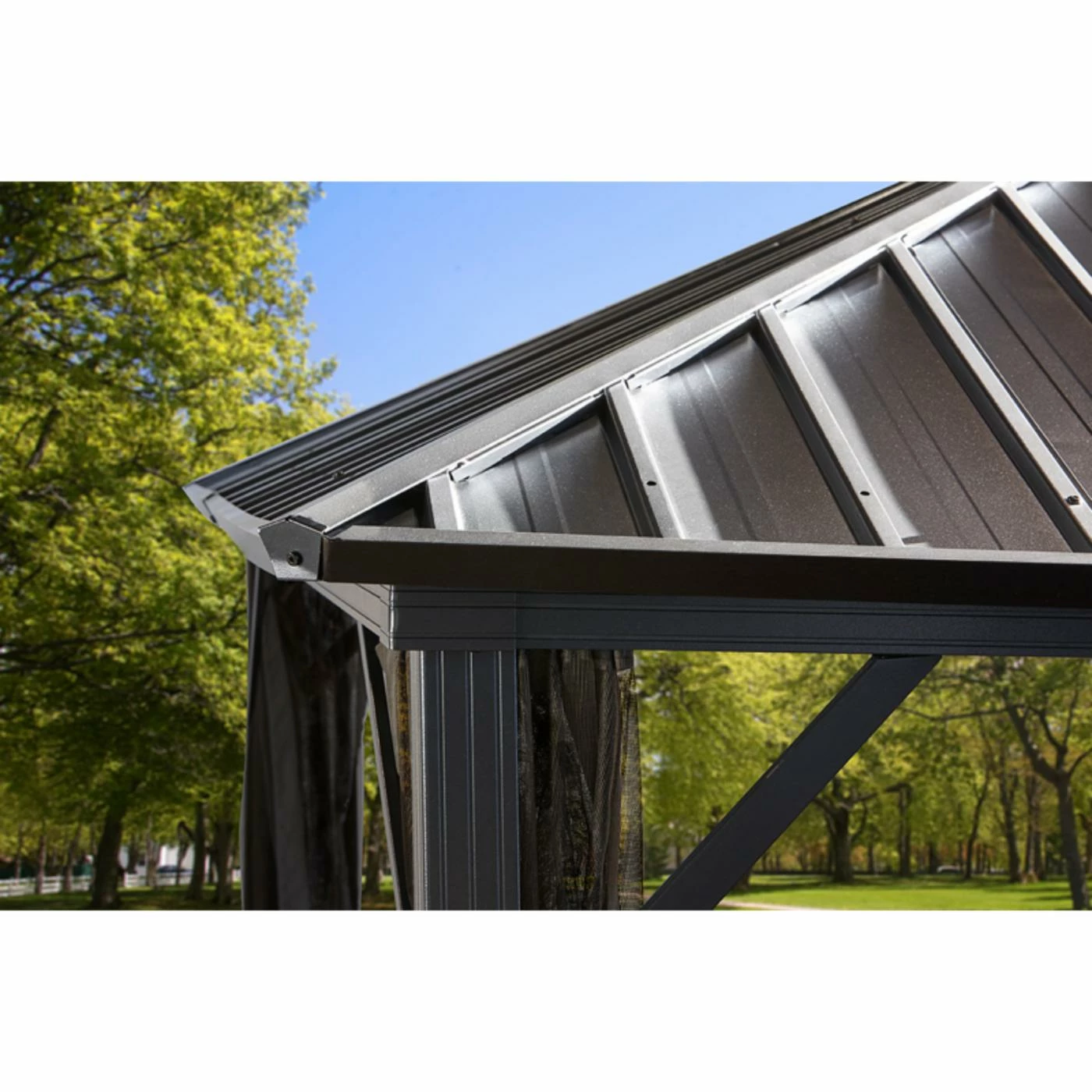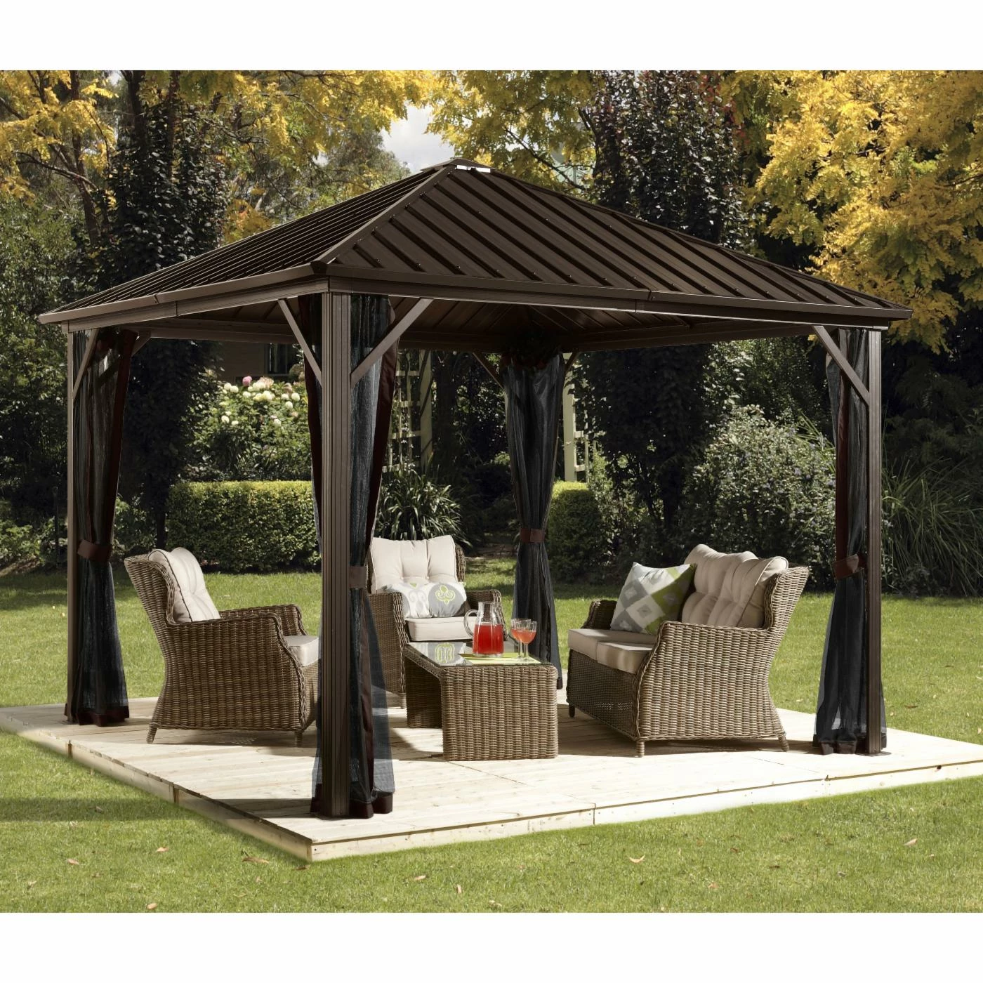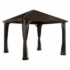 Shelter your outdoor lounge area with the SOJAG INC Dakota Gazebo. This gazebo is durably constructed of powder-coated aluminum in a dark brown finish. The roof is made of galvanized steel panels. The two track system is equipped with nylon mosquito netting and polyester privacy curtains with tie backs.
