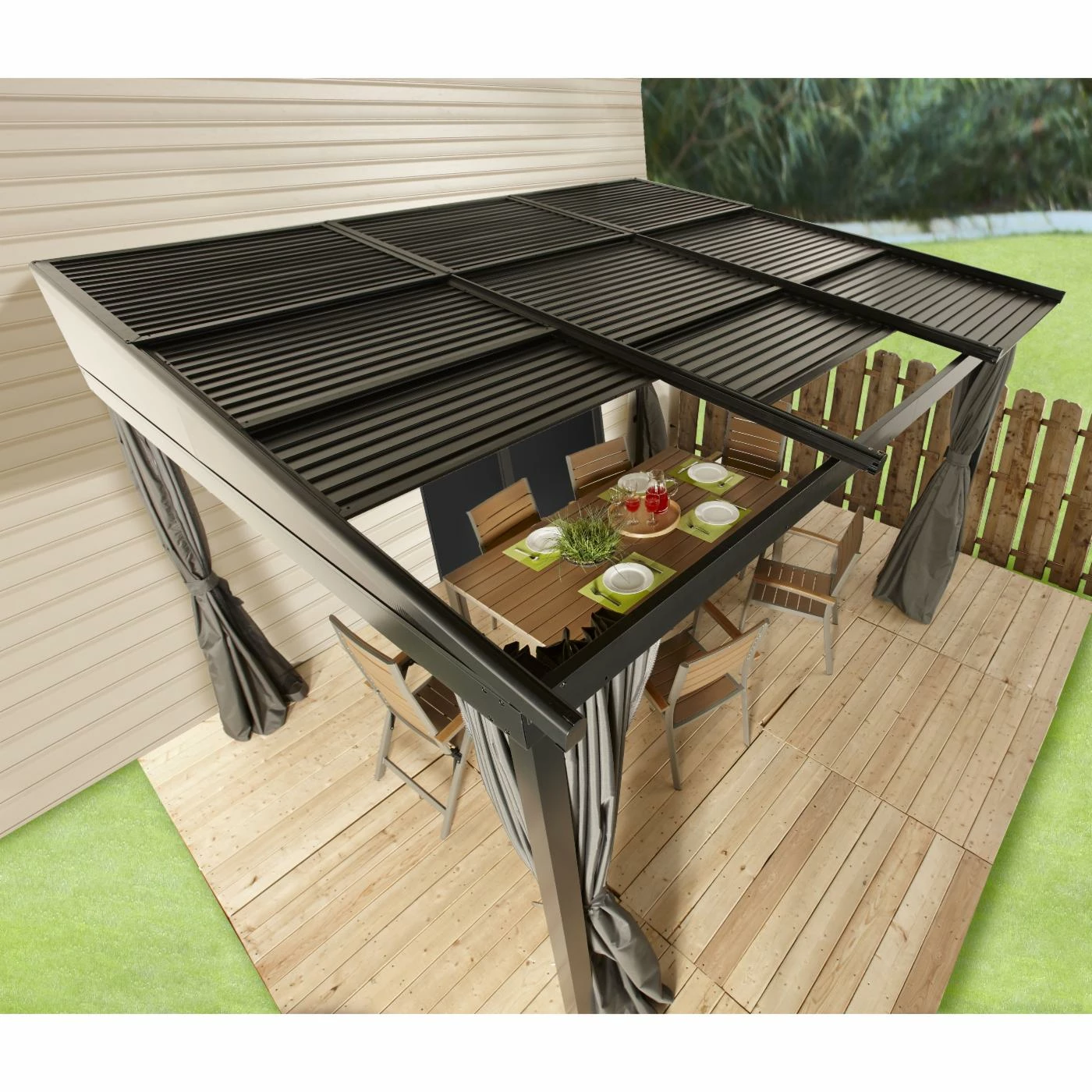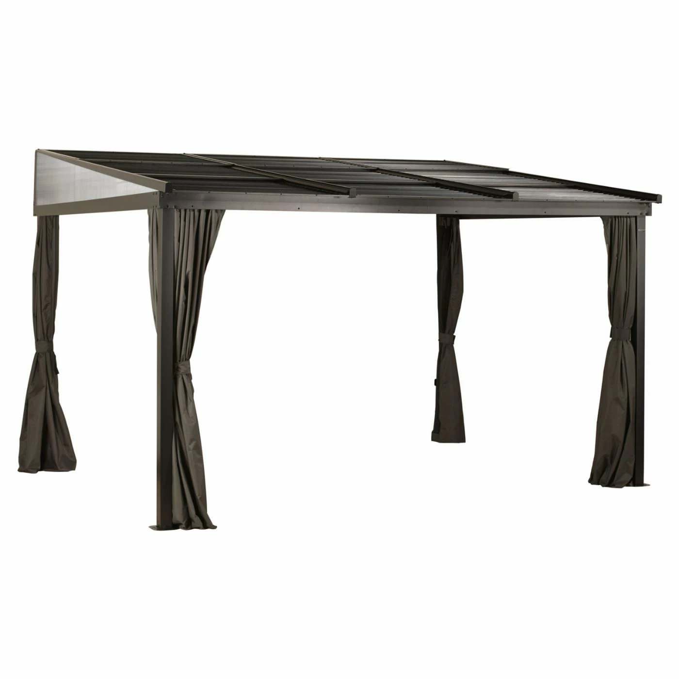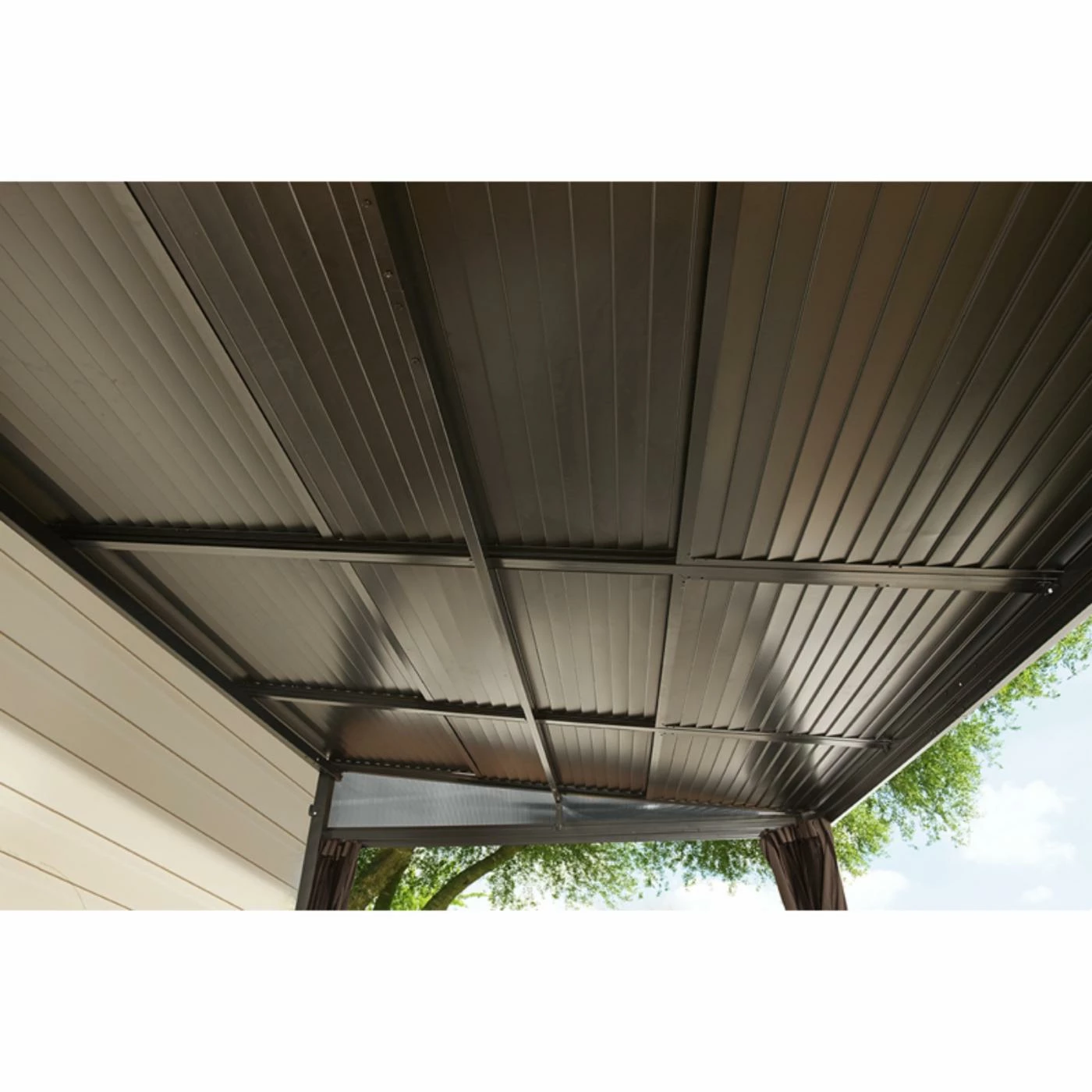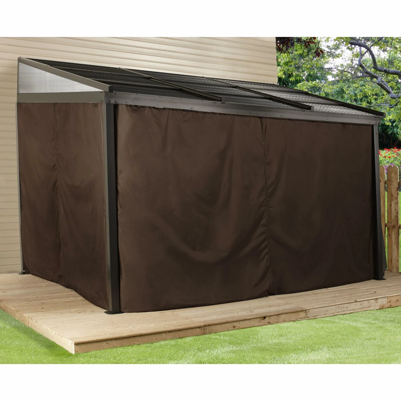 The SOJAG INC Francfort 10 x 12 ft. Wall Mounted Gazebo provides full or partial sun to shine on your patio arrangement. The roof on this gazebo features retractable galvanized steel panels, so you can adjust the amount of shade. The frame is made of powder-coated aluminum in a dark brown finish. The two track system is equipped with nylon mosquito netting and polyester privacy curtains.
