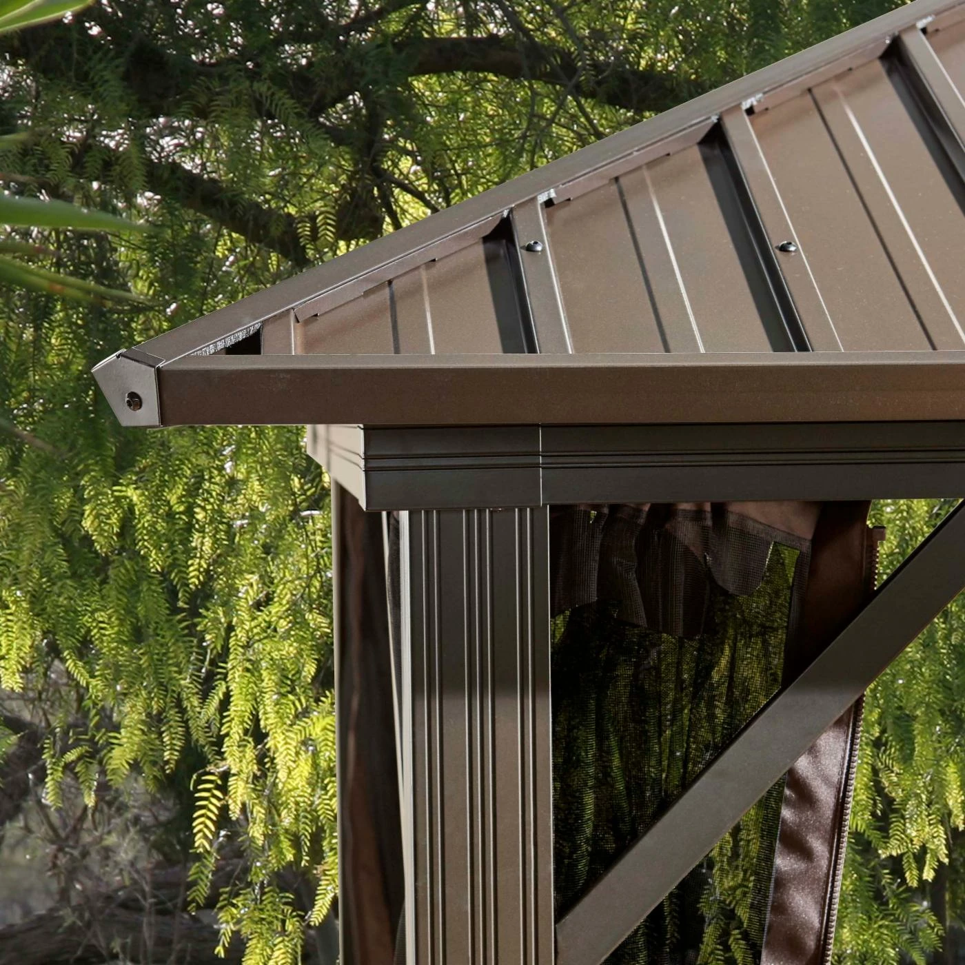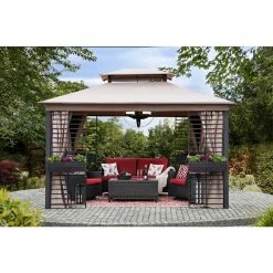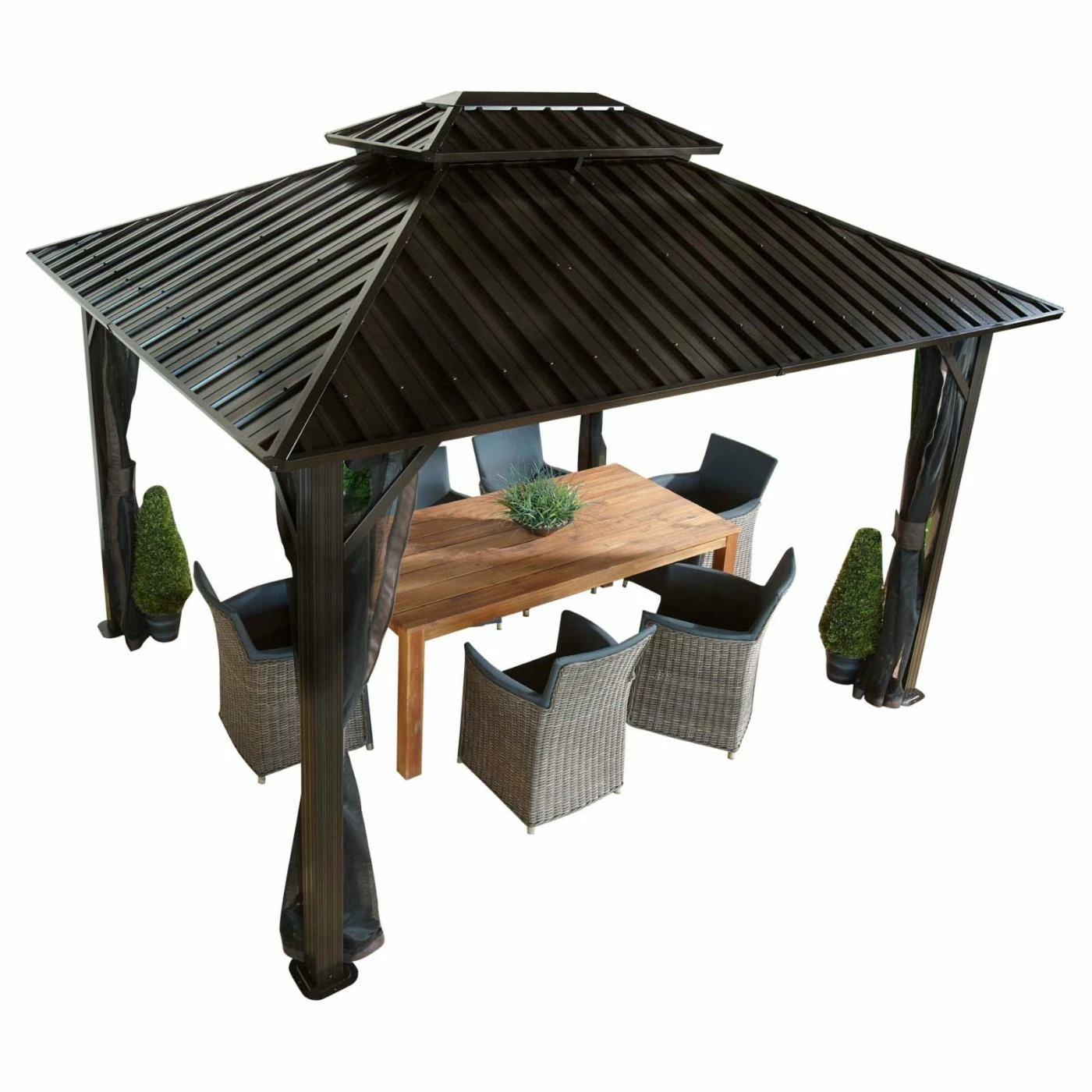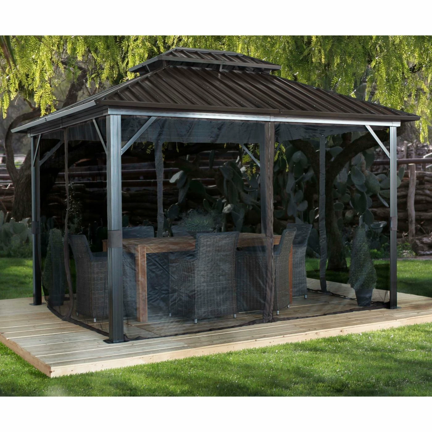 Enclose your outdoor living area with the SOJAG INC Genova Double Roof Gazebo. This gazebo has a durable powder-coated aluminum frame and a galvanized steel roof in a dark brown finish. For comfort, it includes mosquito netting, and for privacy, it includes nylon mosquito netting.