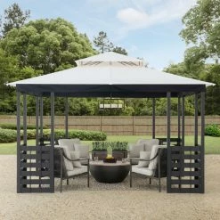 Don’t let rain or nagging insects ruin your outdoor dinner parties, and when you outfit your backyard with the SOJAG INC Sanibel II 8 x 8 ft. Gazebo with Insect Netting, they won’t. Constructed with a sturdy and rustproof aluminum frame and a galvanized steel roof, this gazebo is built to endure the elements like a champ. Its handsome dark gray finish allows it to pair easily with your existing outdoor furnishings. A double track system enables you to easily hang the included mosquito netting or the curtains of your choosing. Place your outdoor patio or dining set beneath this gazebo and you’re ready to party.