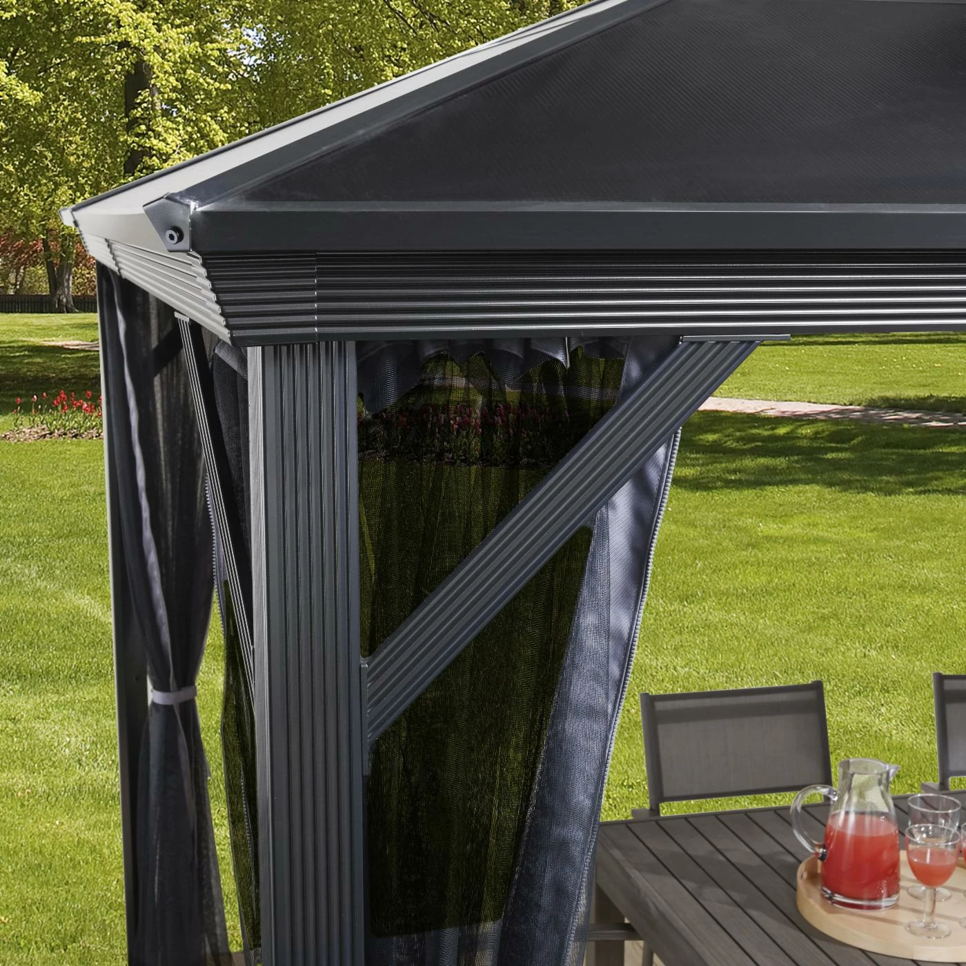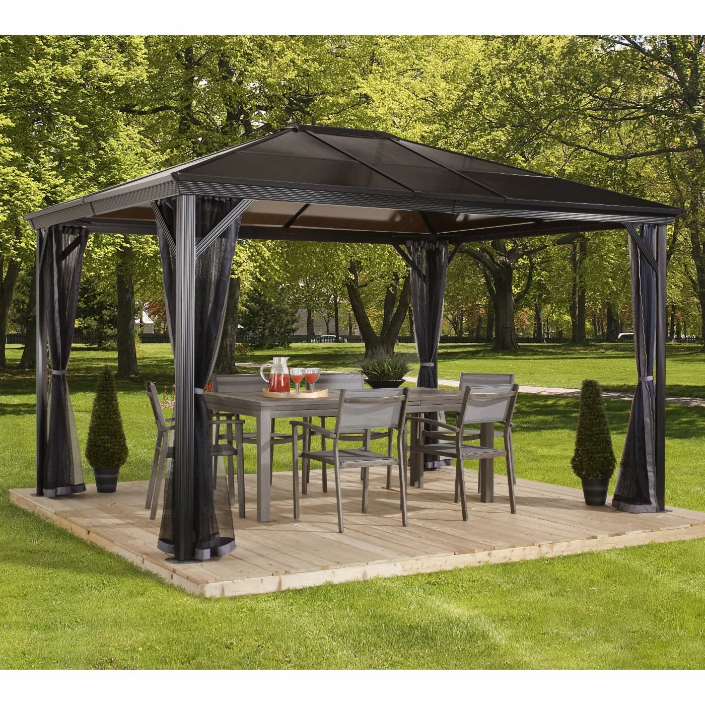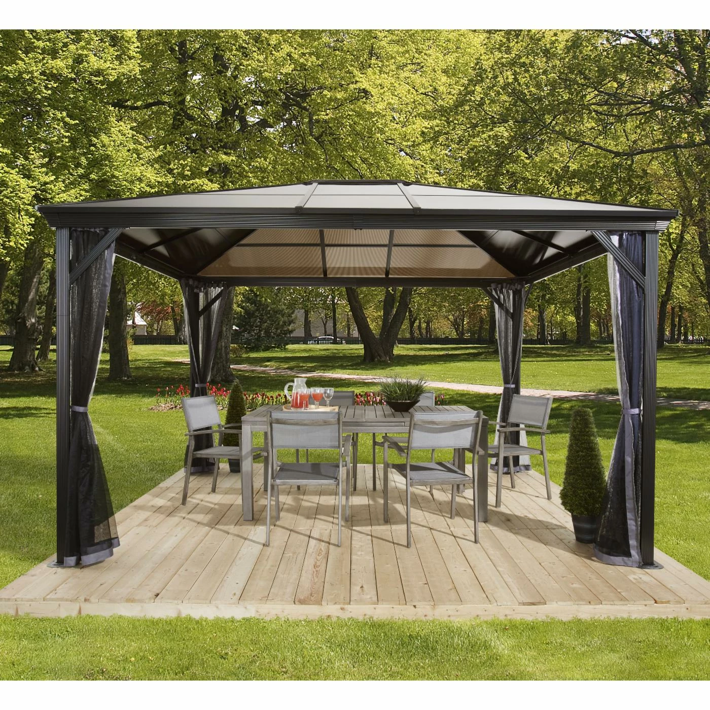 Enclosed with the SOJAG INC Verona Gazebo, your patio arrangement is shaded for comfort. This gazebo features a two-track system that’s made of powder-coated aluminum. 6-millimeter polycarbonate roof panels are tinted and UV protected. Choose from the available sizes to best accommodate your outdoor space. Nylon mosquito netting is included to keep bugs away.