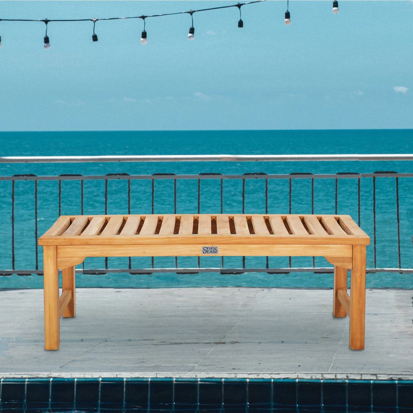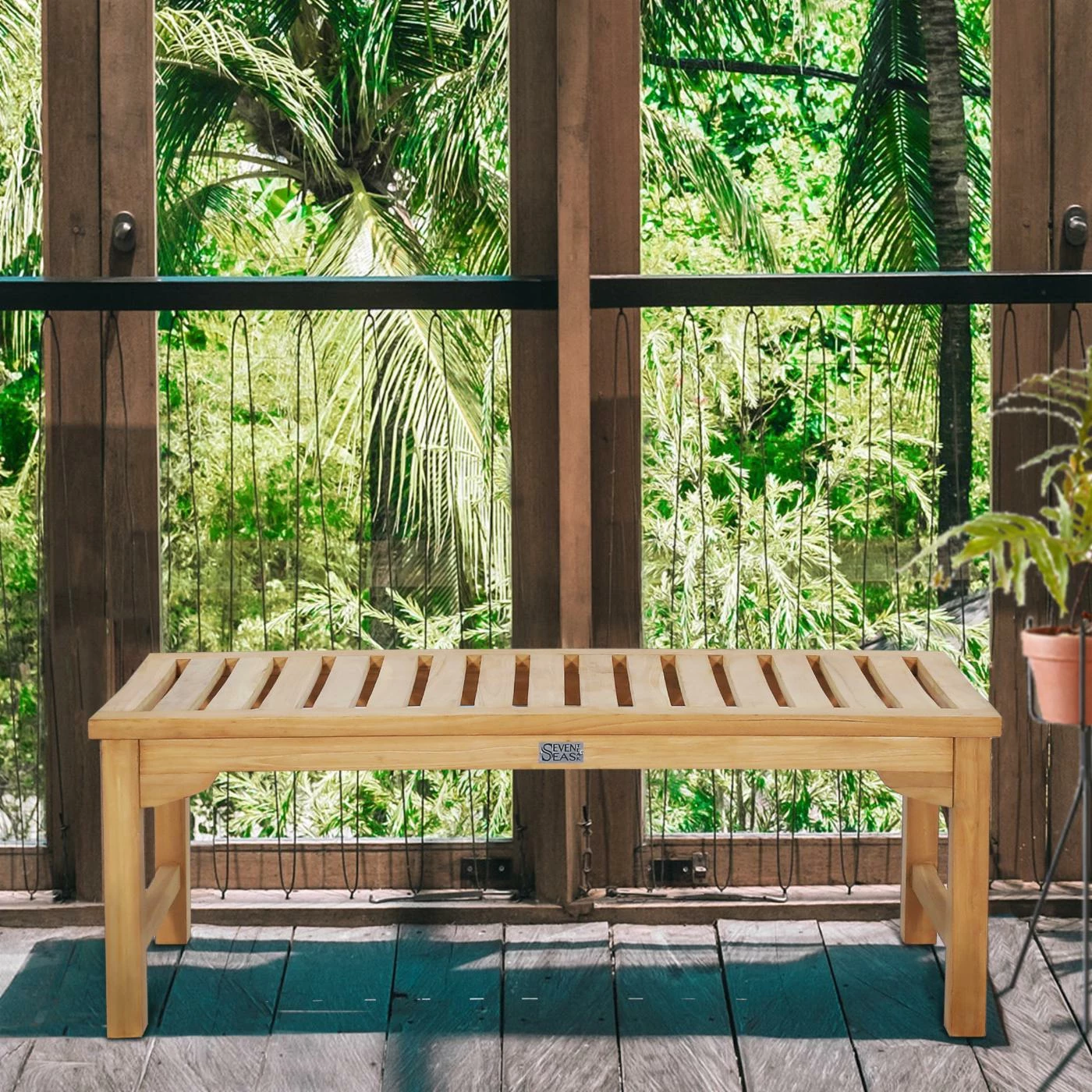 TheΒ Seven Seas Teak Outdoor Backless Bench is ideal for small spaces. This backless bench is a versatile choice for indoor or outdoor use. Itβs ideal for your outdoor space, thanks to its durable, weather-resistant construction. Crafted of teak wood, this bench features a natural, sanded finish for a sophisticated look. This bench also has a slightly curved seat for extra comfort.