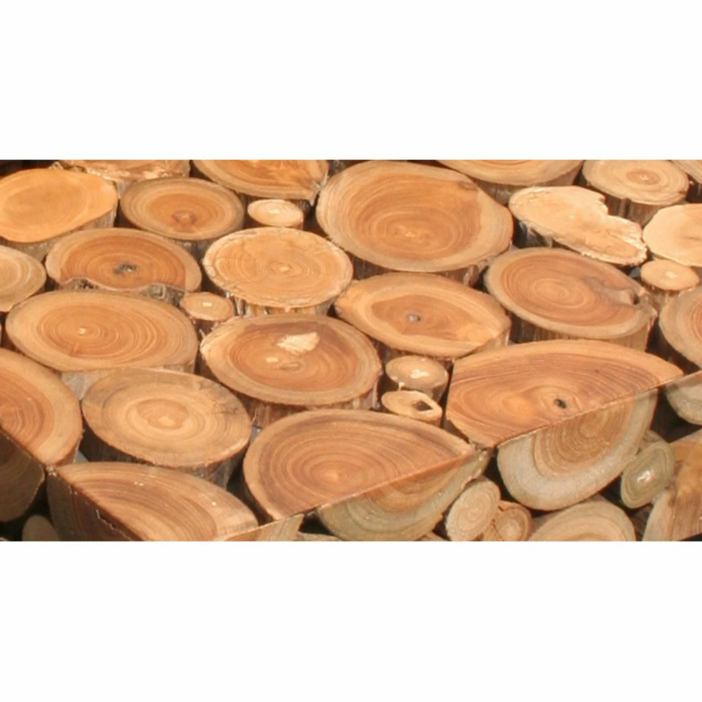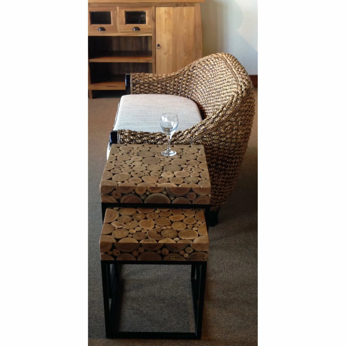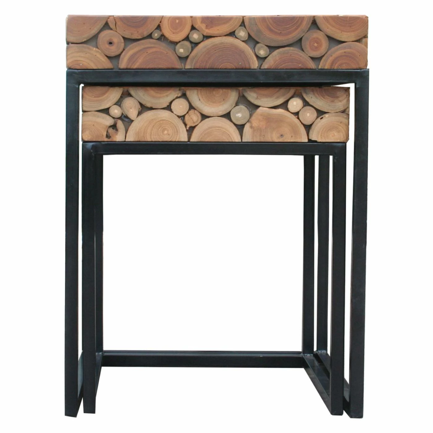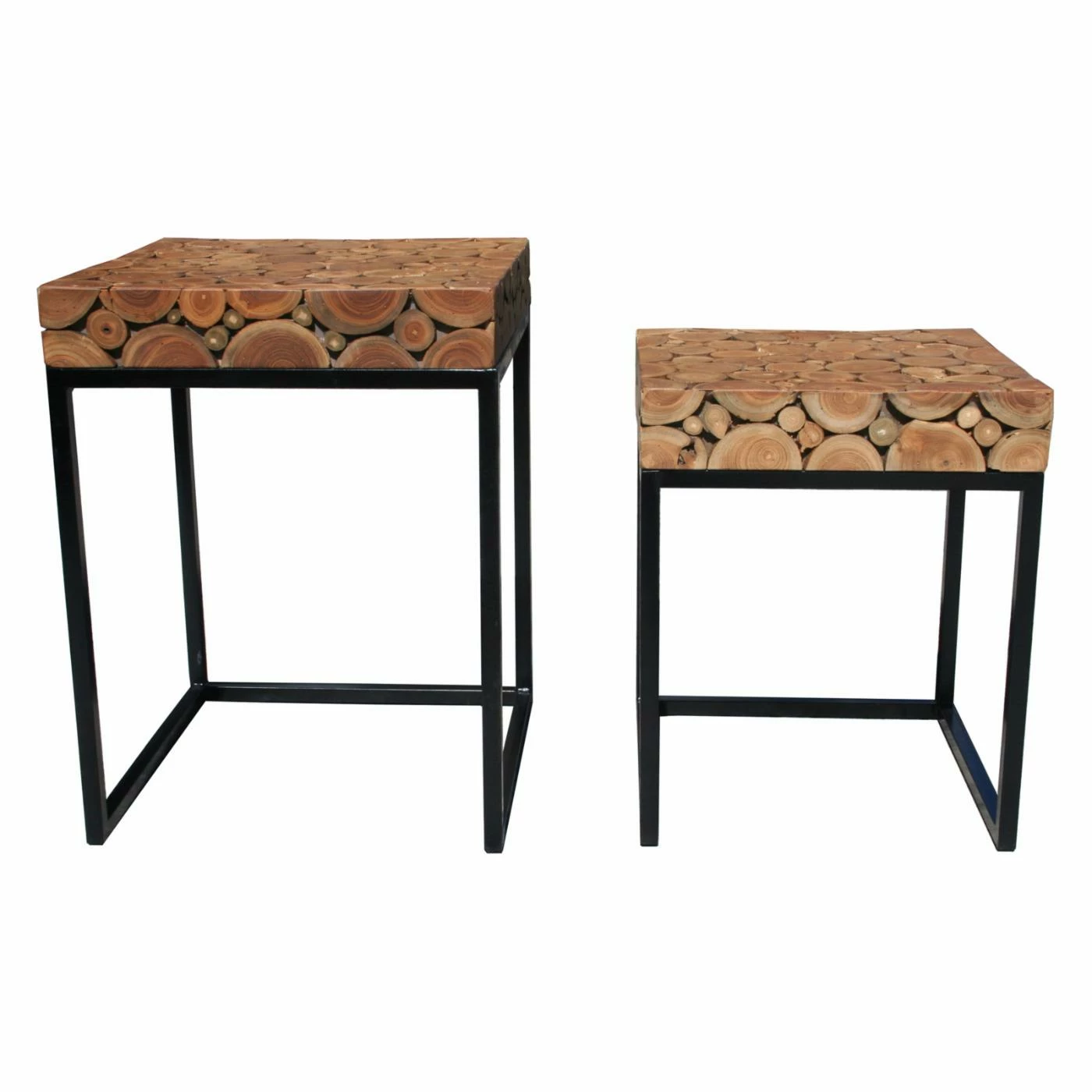 Simultaneously functional and visually appealing, the Chic Teak Teak Wood Nesting Side Tables – Set of 2 is a fabulous addition to any space. This set of two nesting tables are made of cross-sections of teak wood logs, creating a unique, multilayered look. Each table sits on a black metal base for durability and a touch of modern style. With its nesting design, one table snugly fits under the other whenever you need to maximize floor space. Use them to serve up appetizers and drinks, or enjoy them on each side of the sofa for a stylish surface space.