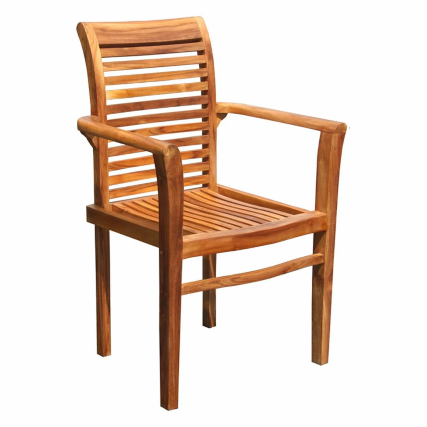 Perfect for small outdoor dining areas and for seasonal use by the pool or on the patio, the Chic Teak Rio Teak Stacking Patio Dining Chair has a smart, chic design. You can stack the chair four high for easy storage at the end of the summer or when you’re finished entertaining. Designed with comfort in mind, the solid, A-grade teak wood chair has a gently curved back and seat formed out of slender slats. Half moon arms support your elbows for added luxury. Finished in natural brown, the chair shows off the innate beauty of teak wood and comes assembled for immediate use.