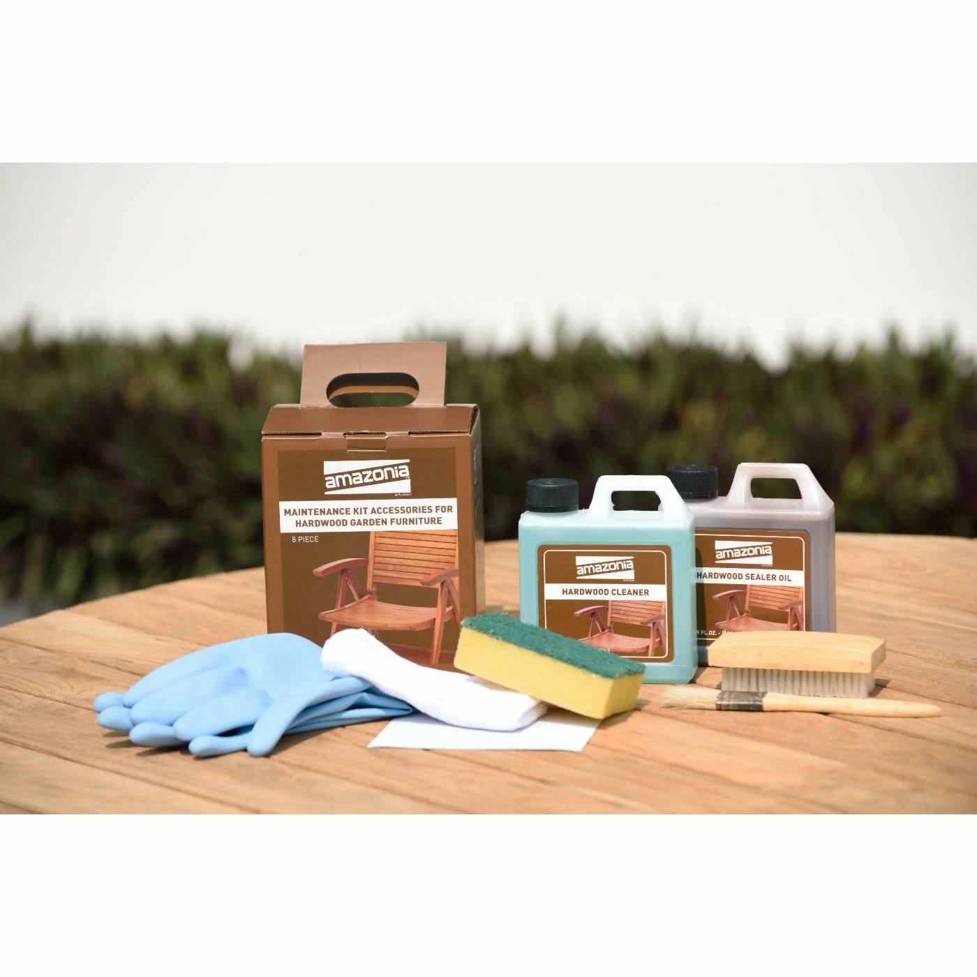 Maintenance set includes: Wood cleaner, wood sealer oil, 2 brushes, sponge, cotton cloth, emery paper, and gloves.