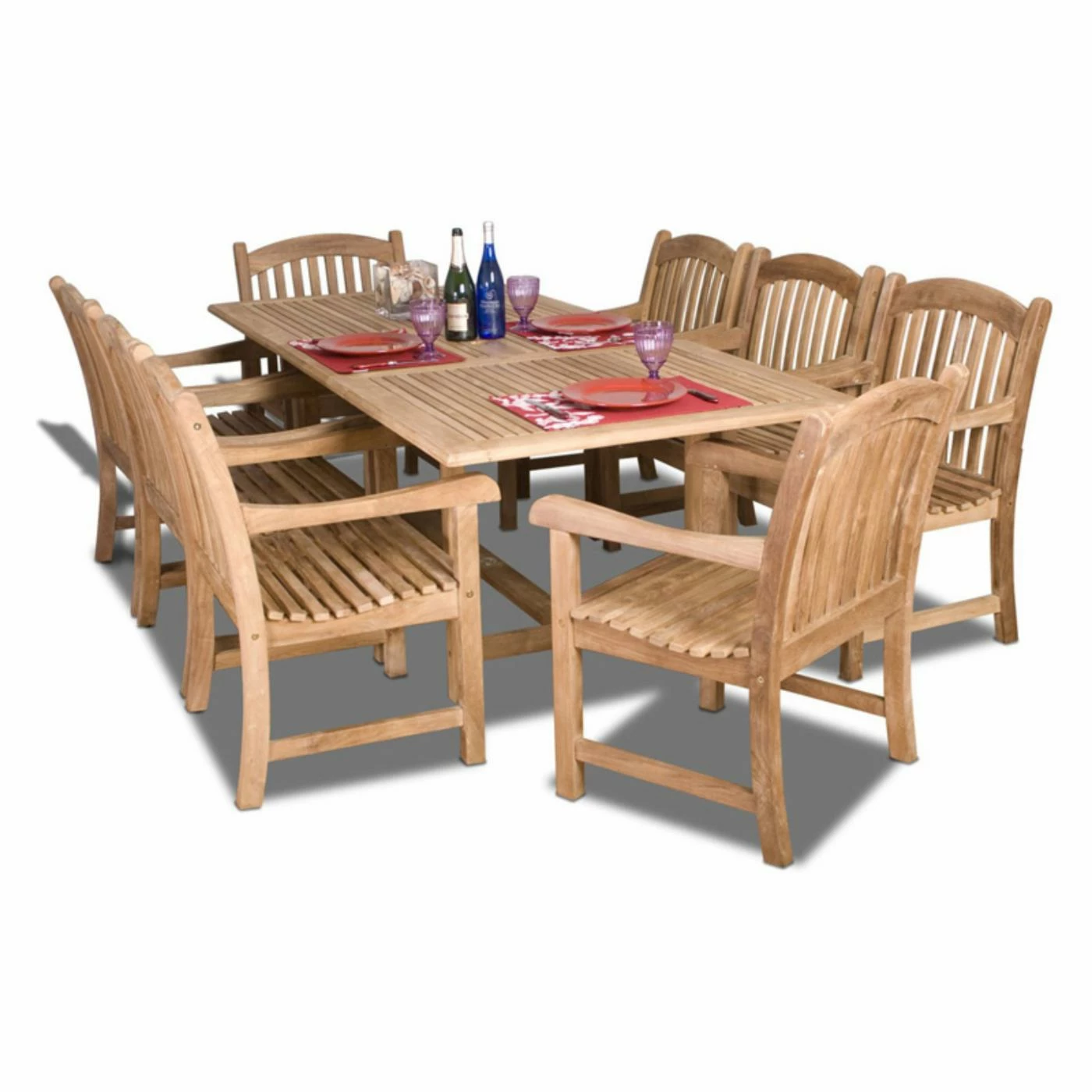 The Amazonia Newcastle Teak Dining Set – Seats 8 is glowing with natural style and eco-friendly construction. This expandable oval table is crafted of renewable teak wood and treated with weather-resilient preservatives to ensure the bright, natural radiance of the table won’t fade, rot, or crack. The table’s extension leaf features an umbrella port. Gather the eight wide resting armchairs around for relaxed comfort and dining elegance that’ll have your neighbors inviting themselves over every night during the summer.