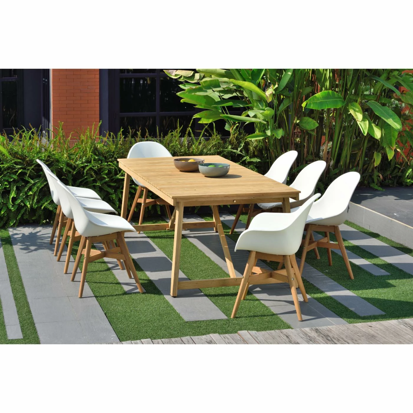 Family and friends will love gathering around the Amazonia Valli Reclaimed Teak 9 Piece Patio Dining Setfor outdoor parties. Crafted with responsibility harvested eucalyptus wood, the patio table is known for both its craftsmanship and durability. Eight chairs feature eucalyptus legs with white resin seats to finish the look. Use this set on your patio or bring it inside for your regular dining room.