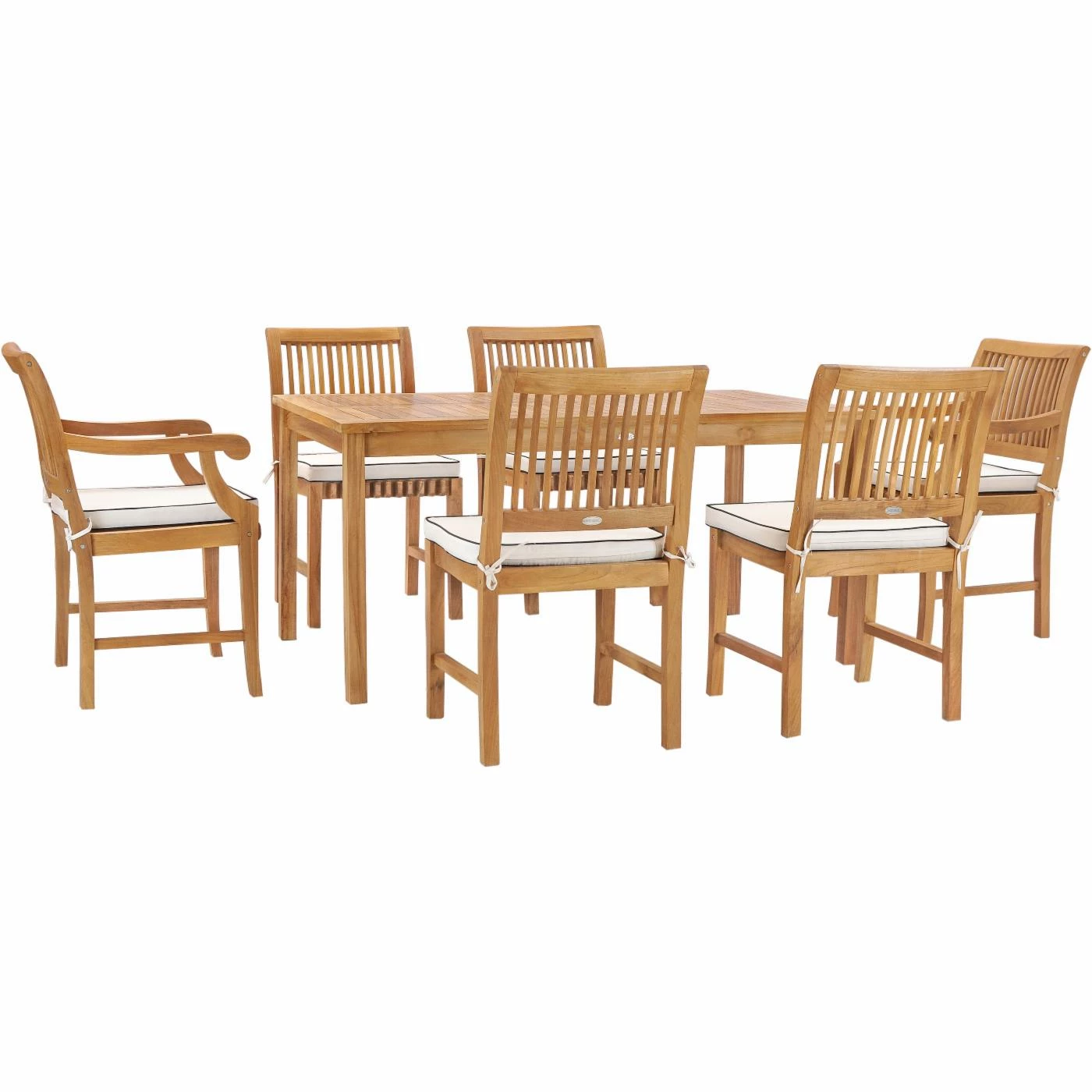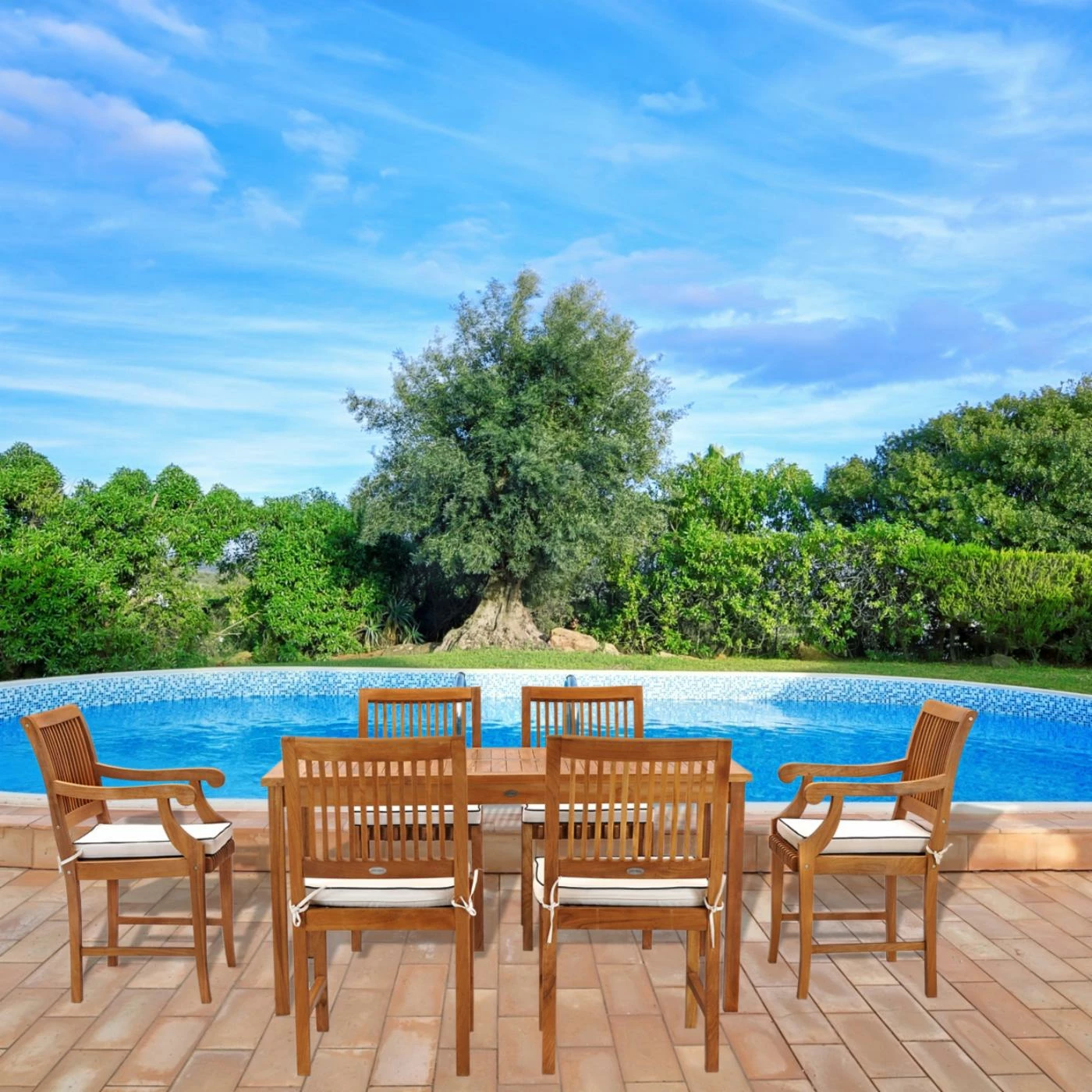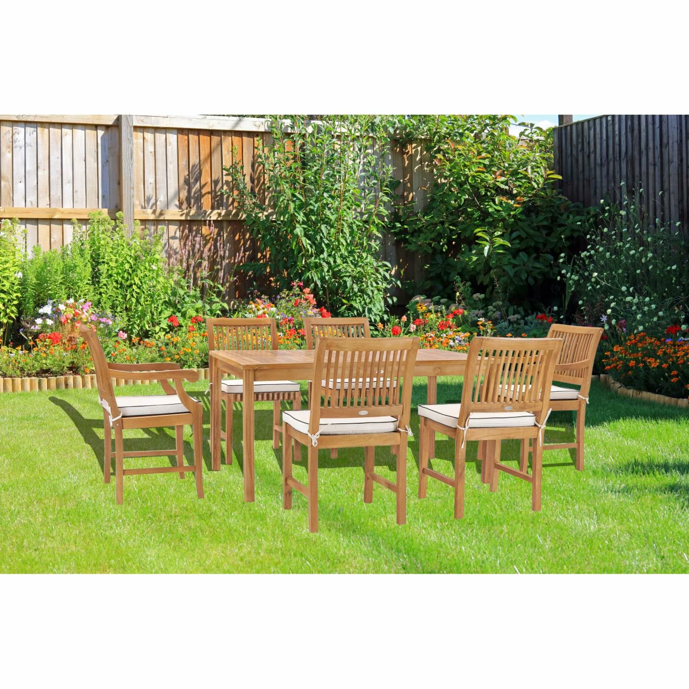 The Chic Teak Bermuda 7 Piece Teak Wood Patio Dining Set with 2 Arm Chairs and 4 Side Chairs includes a rectangular table in choice of sizes, 2 arm chairs, and 4 side chairs with cushions. The classic clean and symmetrical lines of this rectangular teak wood bistro dining table are pleasing to the eye and it’s the perfect place to create memories for years to come. The table includes a 2 in. umbrella hole with a stainless steel cap for when not in use. The unique and rustic Castle dining chairs in this set are as sturdy as they are stylish. Sleek curves and a classic design combine to really make the character of these dining chairs stand out. The table and chairs are handmade from solid A-grade teakwood and stainless steel hardware so they can be used indoors or outdoors year round.