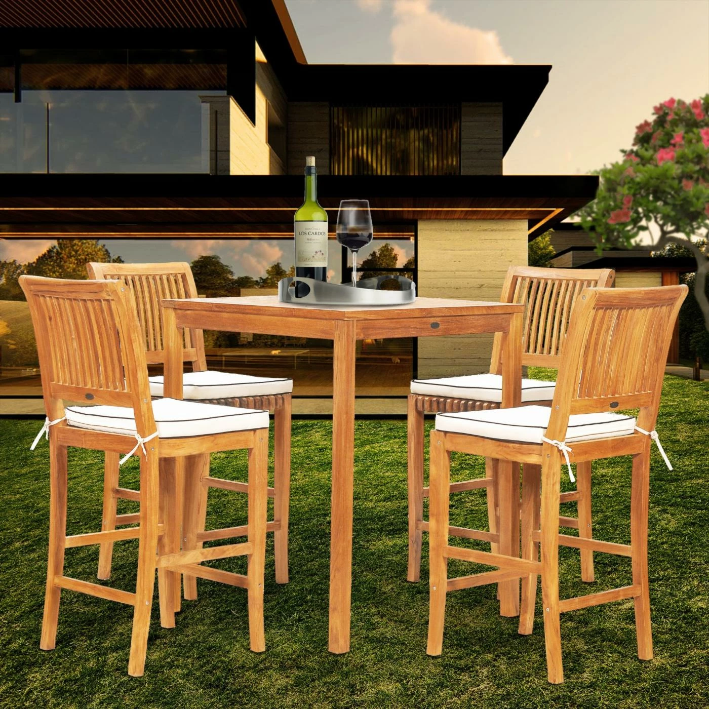 The Chic Teak Castle 5 Piece Bar Height Patio Dining Set includes a 35in. Square Bar Table and 4 Barstools with Cushions. The square bistro bar table is the perfect size an intimate dinner for two or having drinks with guests. The symmetrical lines and classic clean design of this table is pleasing to the eye and it makes the perfect place to create memories for years to come. The unique and rustic solid Castle Barstools in this set are as sturdy as they are stylish. Sleek curves and a classic design combine to really make the character of these bar chairs stand out. The table and barstools are handmade from solid A-grade teakwood and stainless steel hardware so they can be used indoors or outdoors year round. The quality and craftsmanship that went into these pieces assure that they are made to stand the test of time. The slatted table top makes water drainage easy and the sturdy design is perfect for both commercial and residential use. This teak patio table and bar chair bistro set is perfect for patios, decks, balconies, poolside or any room inside your home.