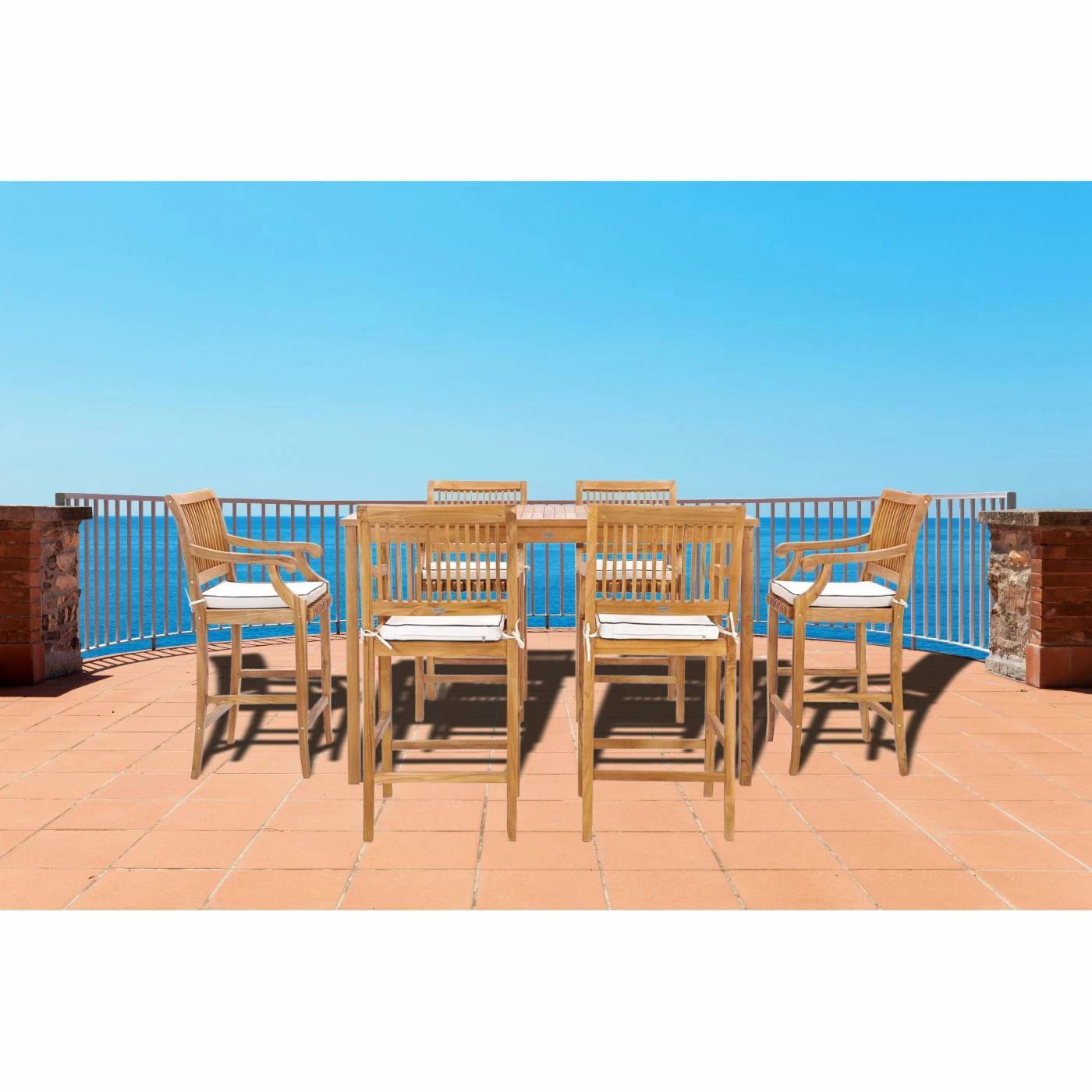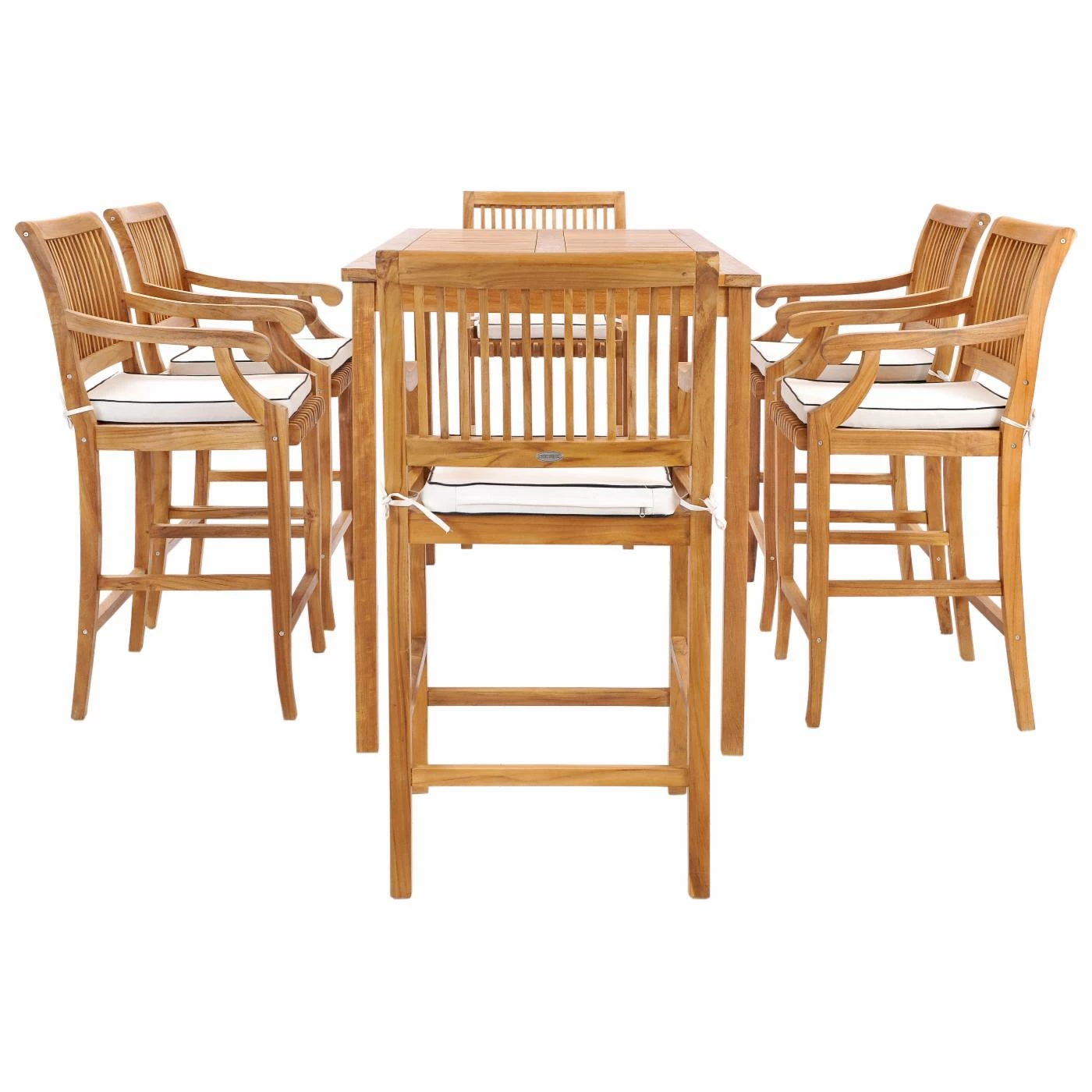 The Chic Teak Castle 7 Piece Bar Height Patio Dining Set with Arm Chairs includes a 71 in. Rectangular Bar Table and 6 Barstools with Arms with Cushions. The 71 inch rectangular bar table in this set includes a 2 in. umbrella hole and stainless steel cap for when not in use. The classic clean and symmetrical lines of the table are pleasing to the eye and they are the perfect place to create memories for years to come. The unique and rustic Castle Barstools in this set are as sturdy as they are stylish. Sleek curves and a classic design combine to really make the character of these bar chairs stand out. The bar table and barstools are handmade from solid A-grade teakwood and stainless steel hardware so they can be used indoors or outdoors year round. The quality and craftsmanship that went into these pieces assure that they are made to stand the test of time. The slatted table top makes water drainage easy and the sturdy design is perfect for both commercial and residential use. This teak patio bar table and barstool bistro set is perfect for patios, decks, balconies, poolside or any room inside your home.