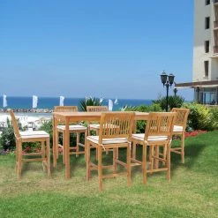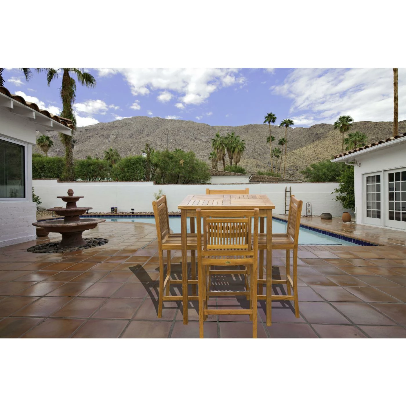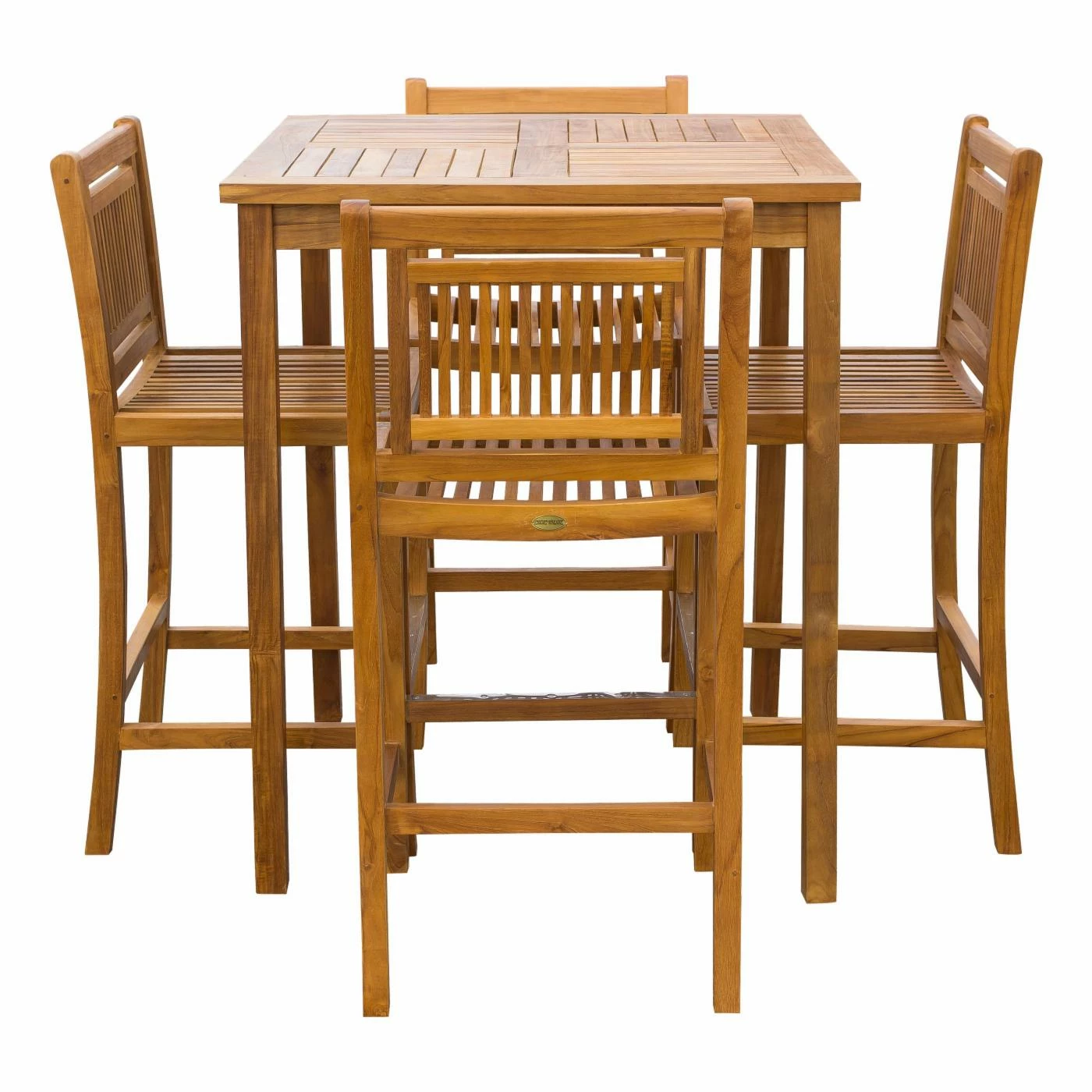 Introduce some comfortable, casual seating to your porch, patio, or deck with the Chic Teak Maldives Teak 5 Piece Patio Dining Set. This set includes a table and four matching stools. Thick Grade-A solid teak constructs the pieces, built with stainless steel hardware and finished in honey brown. Each chair has a wide, slatted seat and backrest. Tea is naturally resistant to water and sun.