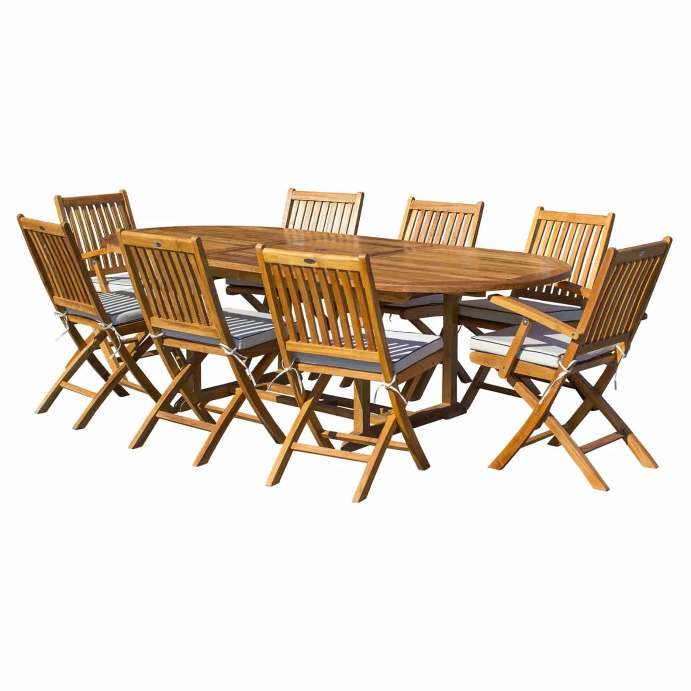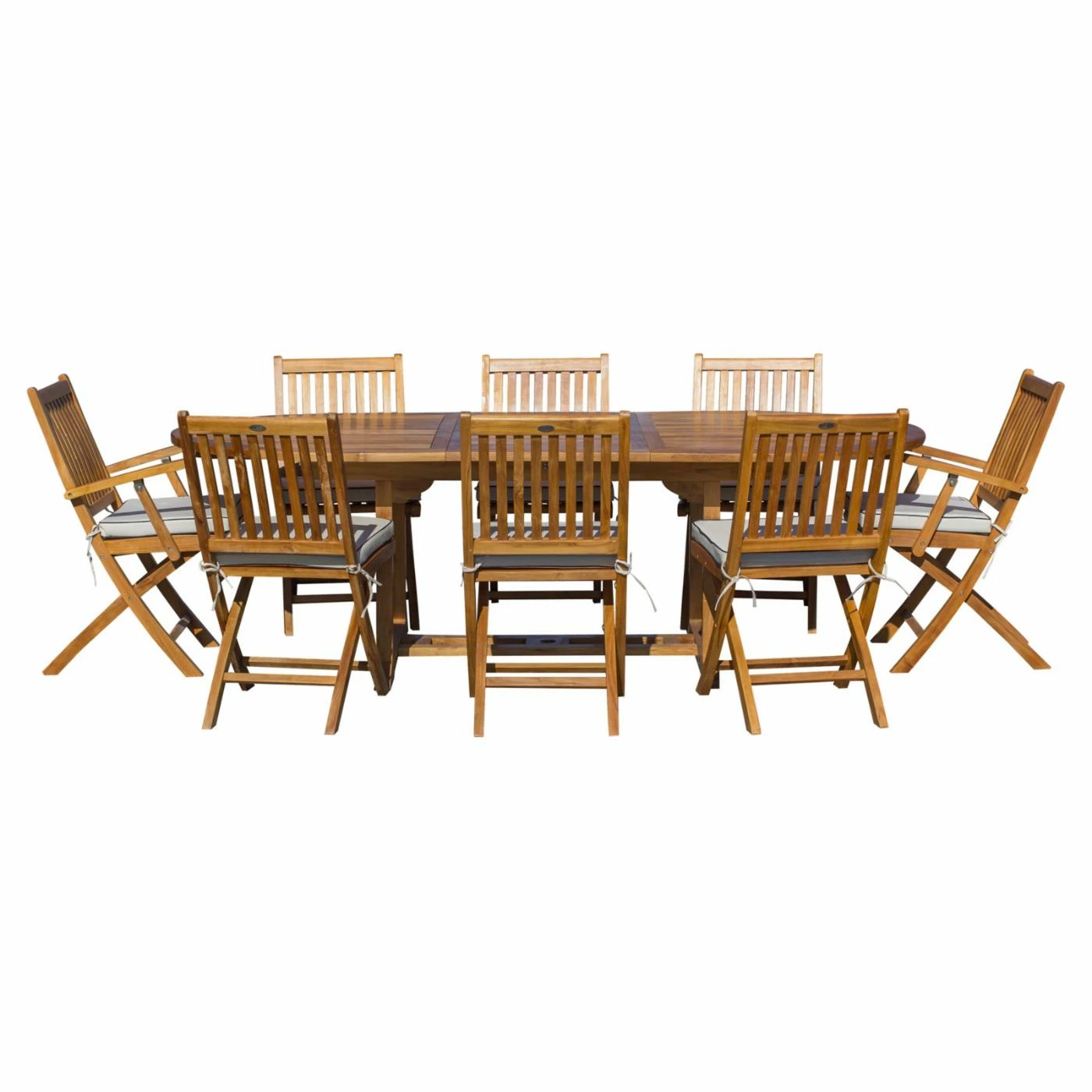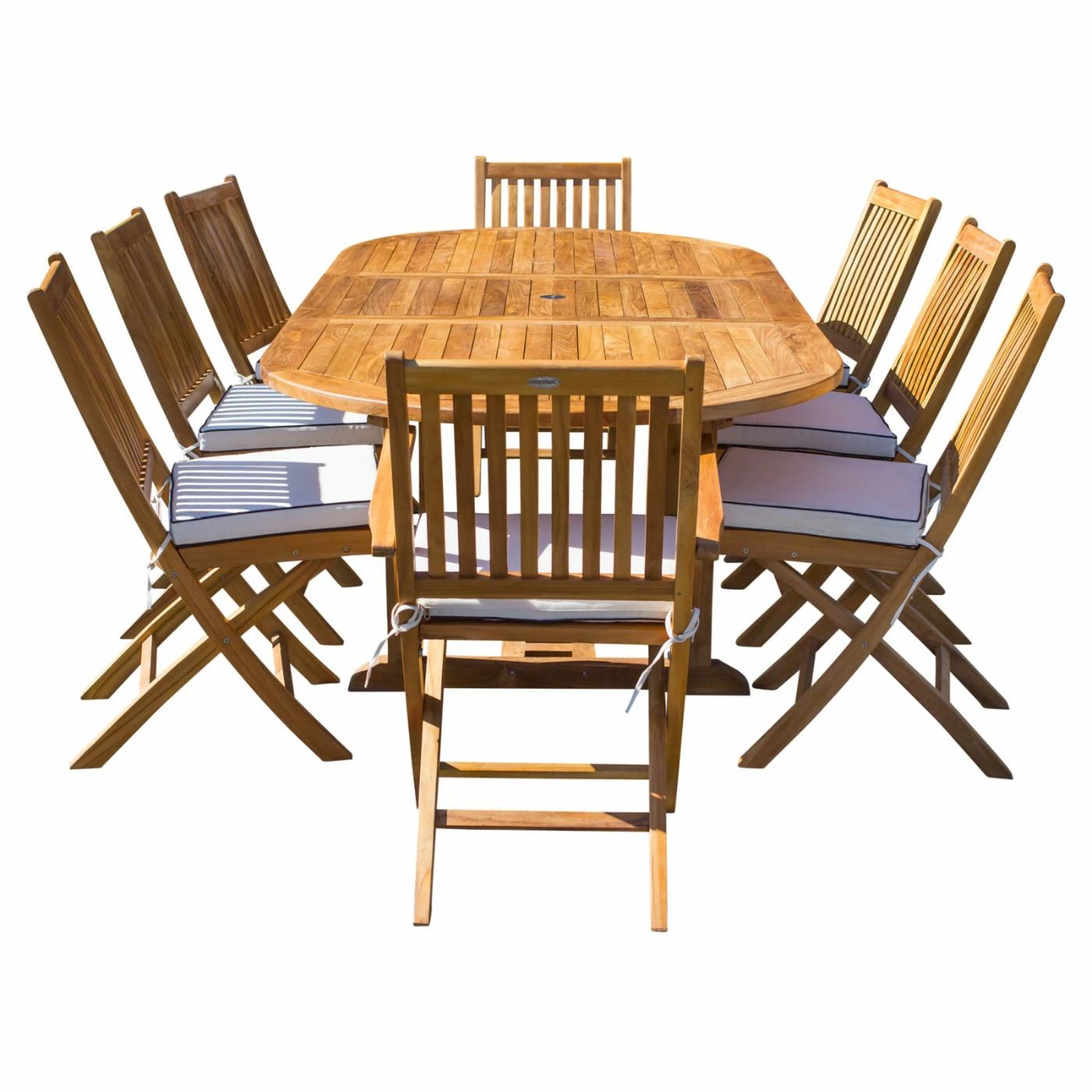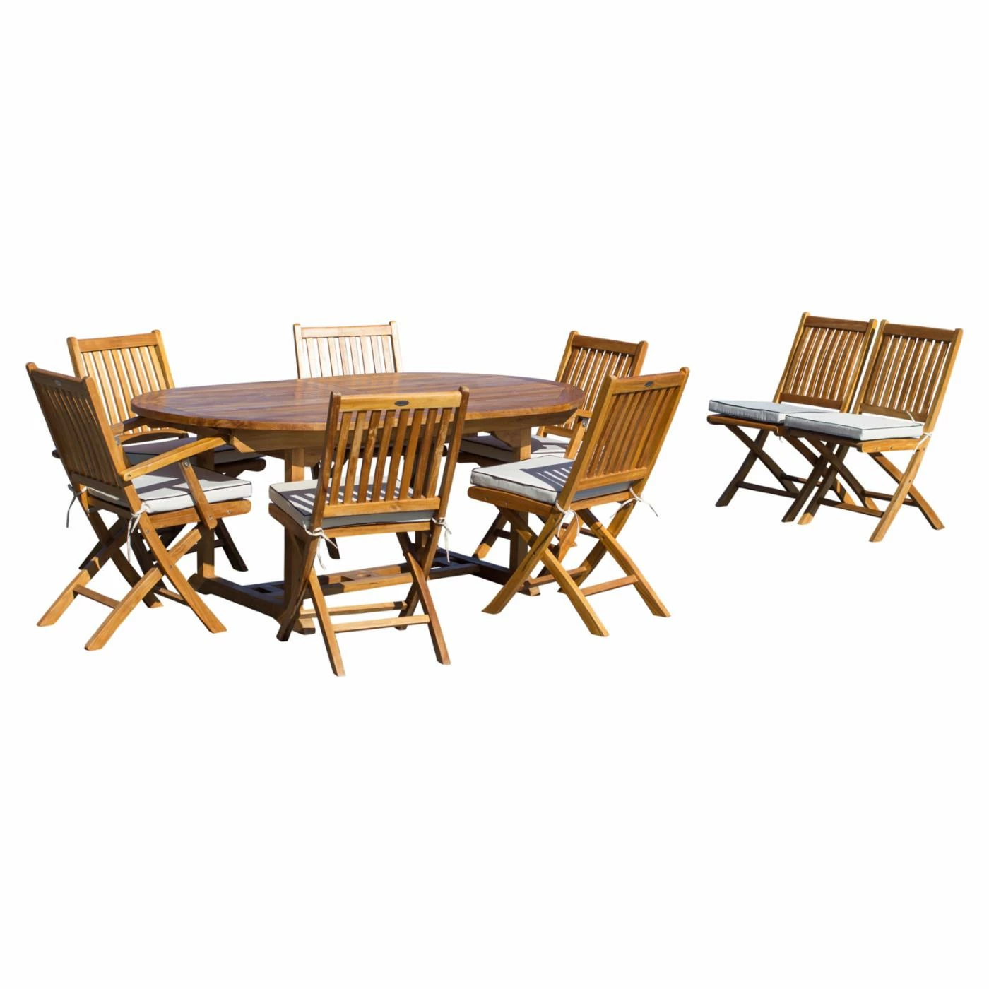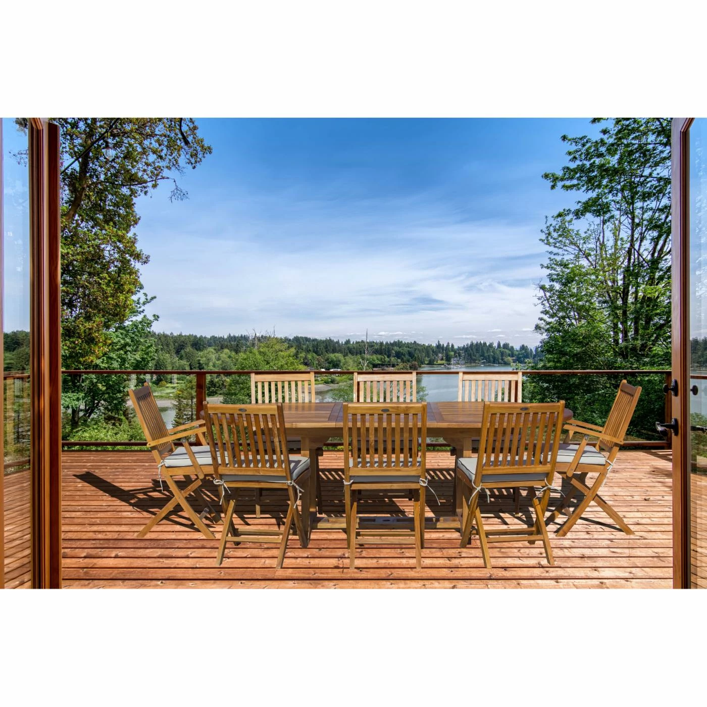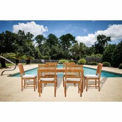 Let the fresh air add to your mealβs flavor with the Chic Teak Miami Teak 9 Piece Rectangle Patio Dining Set. This set includes a spacious, rectangular dining table with eight matching chairs. Solid, weather-resistant teak constructs the frames, secured with stainless-steel hardware and finished in honey brown. The chairs come with wide, slatted backs and waterproof, foam-padded Sunbrella cushions.
