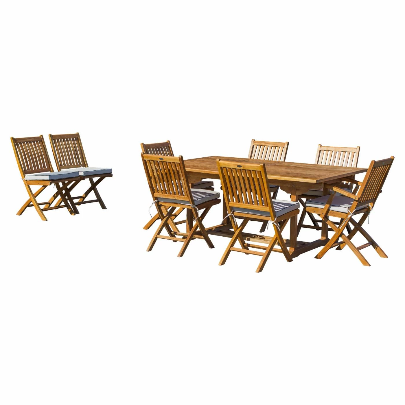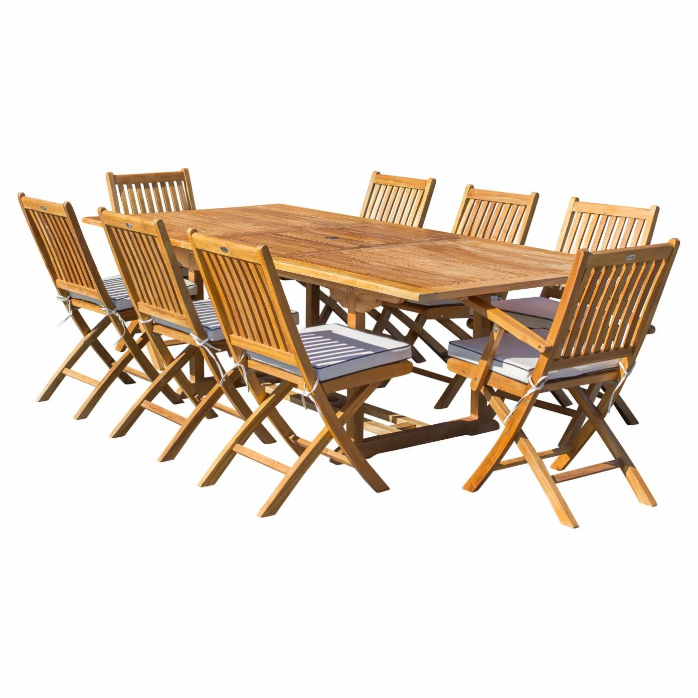 Provide a place for many a poolside memory with the Chic Teak Miami Teak 9 Piece Rectangle Patio Dining Set. This set includes a rectangular dining table and eight matching chairs. Weather-resistant, solid teak wood constructs the frames, featuring a honey-brown finish and stainless-steel hardware. Wide, slatted backrests and foam-padded, all-weather Sunbrella seat cushions provide users with comfort and support from dawn to dusk.