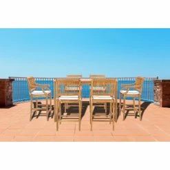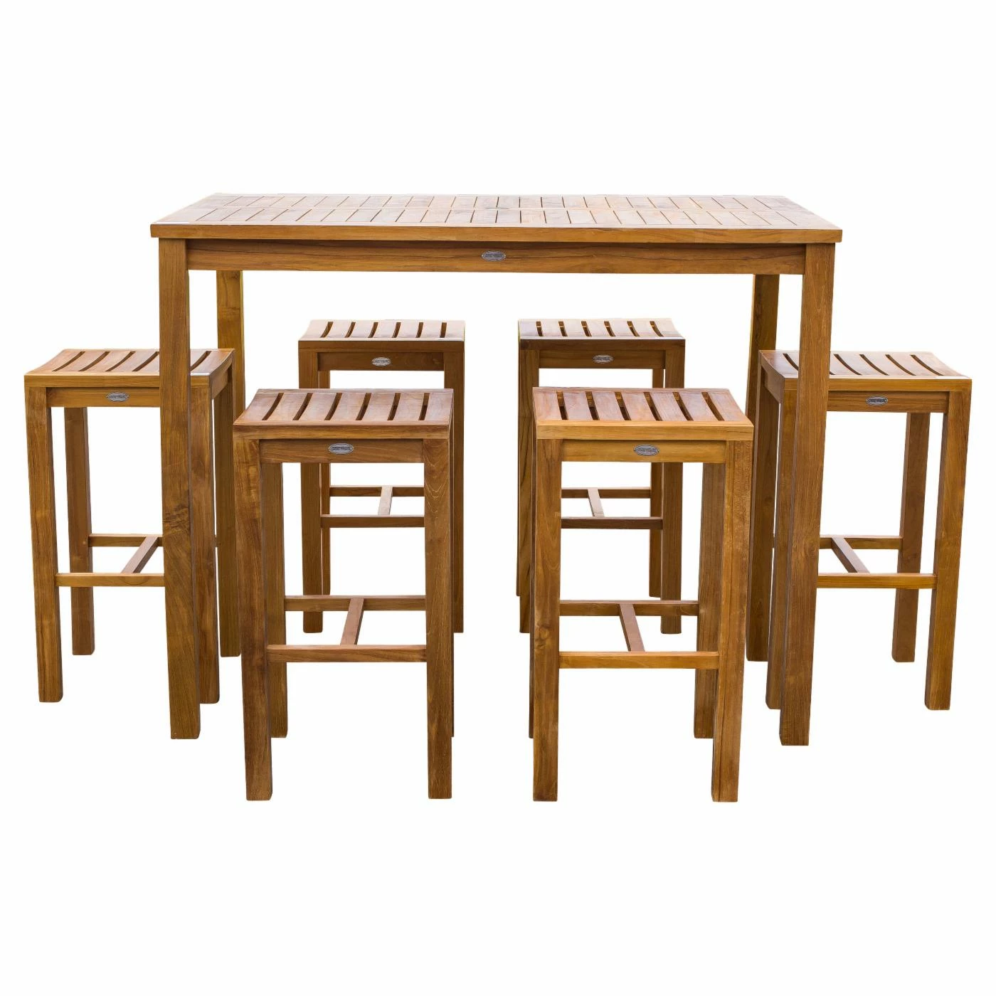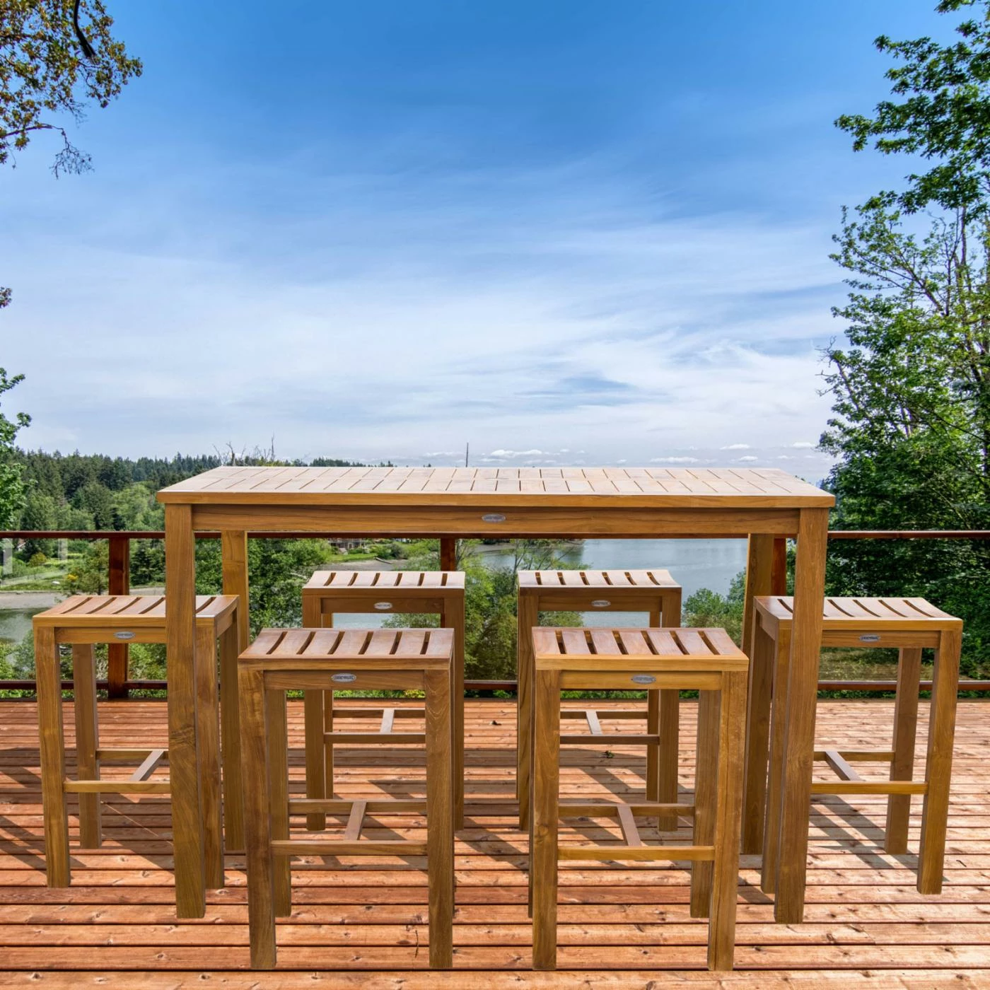 Ready to make your patio more versatile for the summertime? The Chic Teak Santa Monica Teak 7 Piece Patio Dining Set lends you a charming coastal-style space to enjoy barbecue, beverages, and more. A tall, rectangular dining table with block legs and six matching stools are included, all accented with wide slats. Each piece is constructed from solid weather-resistant teak with stainless-steel hardware. A honey brown finish emphasizes the woodโs color and offers extra protection.