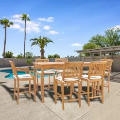 Craft a cozy place to enjoy brunch and mimosas, dinner and drinks, dessert and coffee, and more with the Chic Teak Santa Monica Teak 9 Piece Patio Dining Set. Constructed from solid teak, the set includes a tall rectangular table and eight backless stools. Teak is naturally resistant to warp, rot, and pests. Stainless steel hardware is used to construct the frames, topped by a rich honey-brown finish.