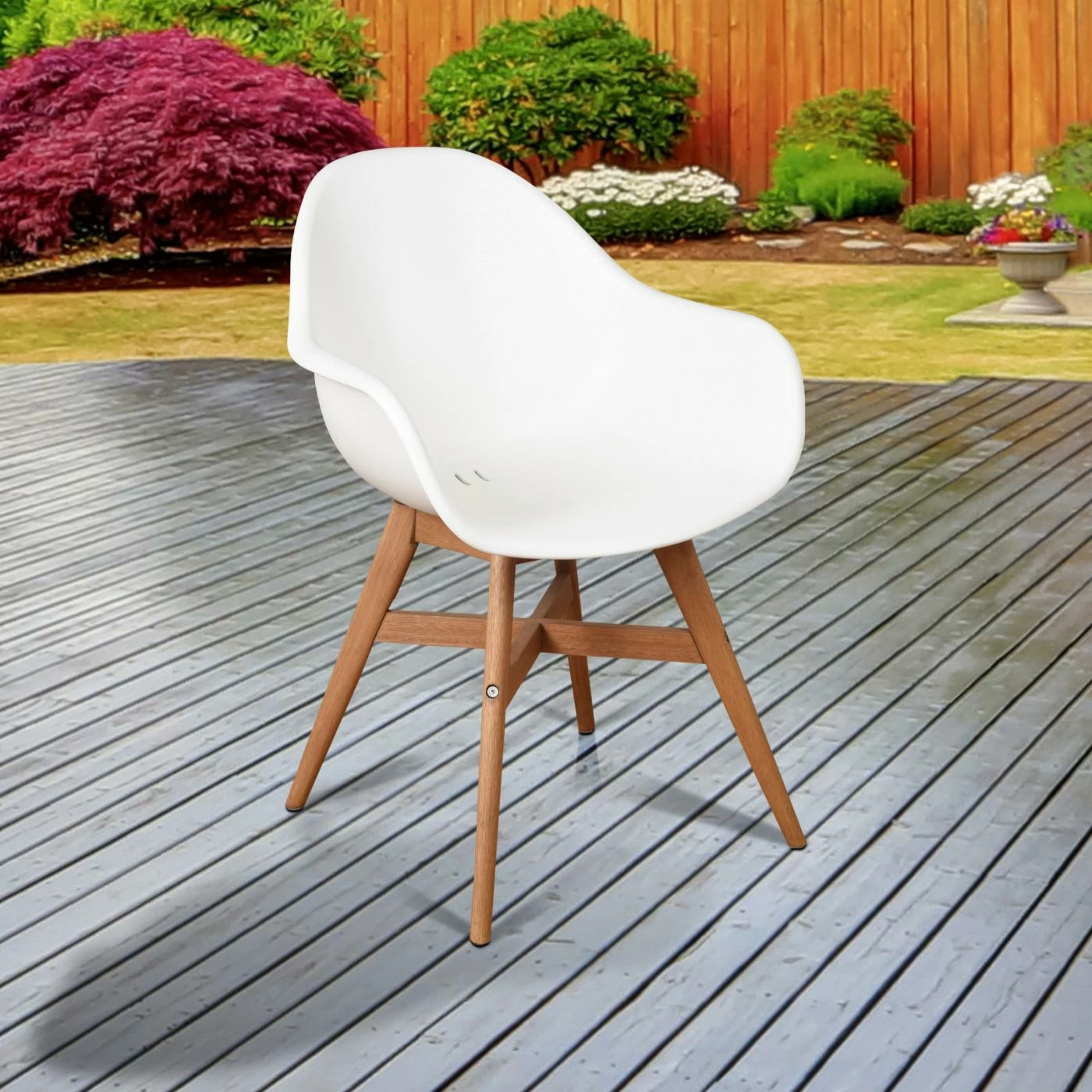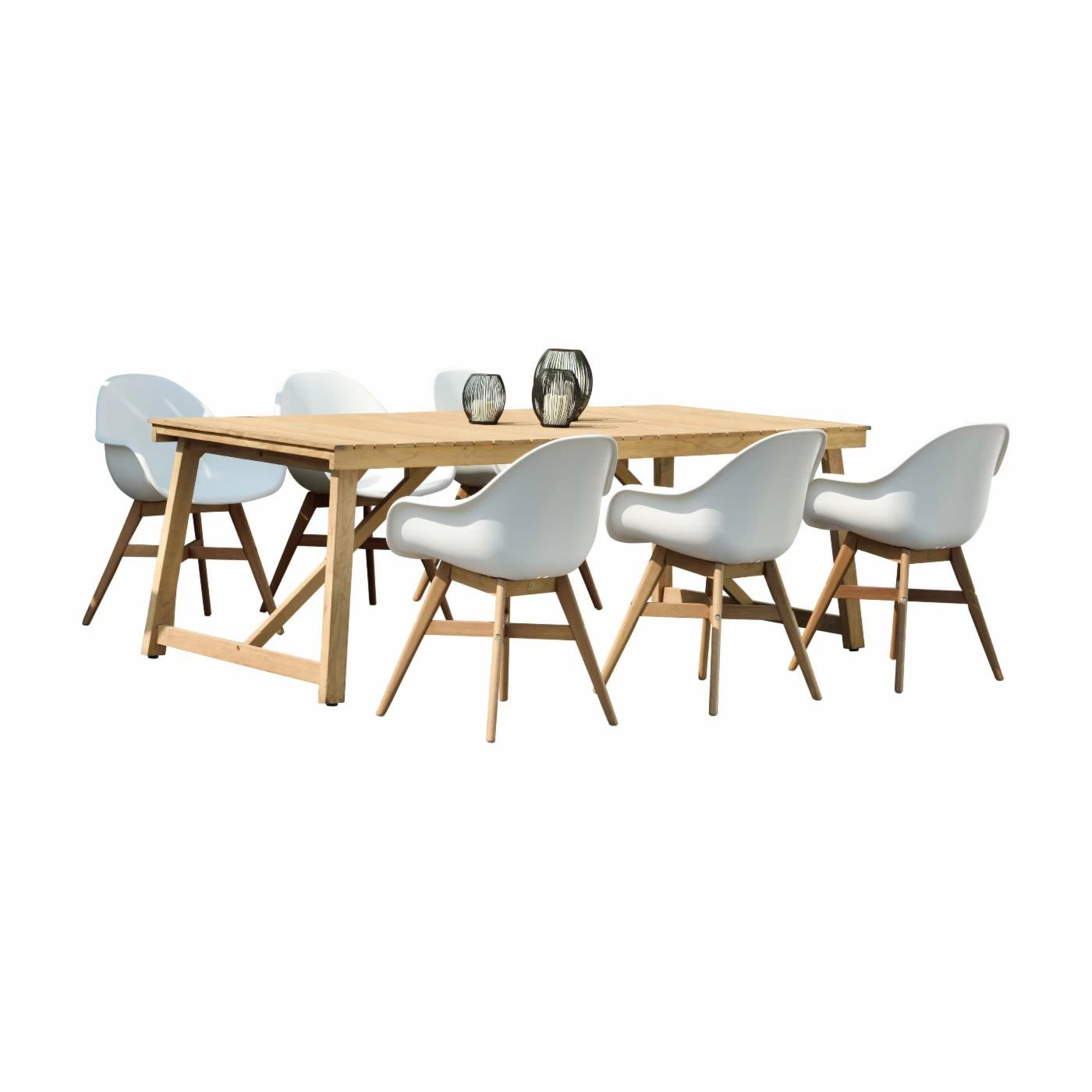 Add a sense of mid-century style to your outdoor dining space with the HN Outdoor Wickham Reclaimed Teak 7 Piece Patio Dining Set. Crafted with responsibility harvested eucalyptus wood, the patio table is known for both its craftsmanship and durability. Six matching chairs feature eucalyptus legs with white resin seats to finish the look. Use this set on your patio or bring it inside for your regular dining room.
