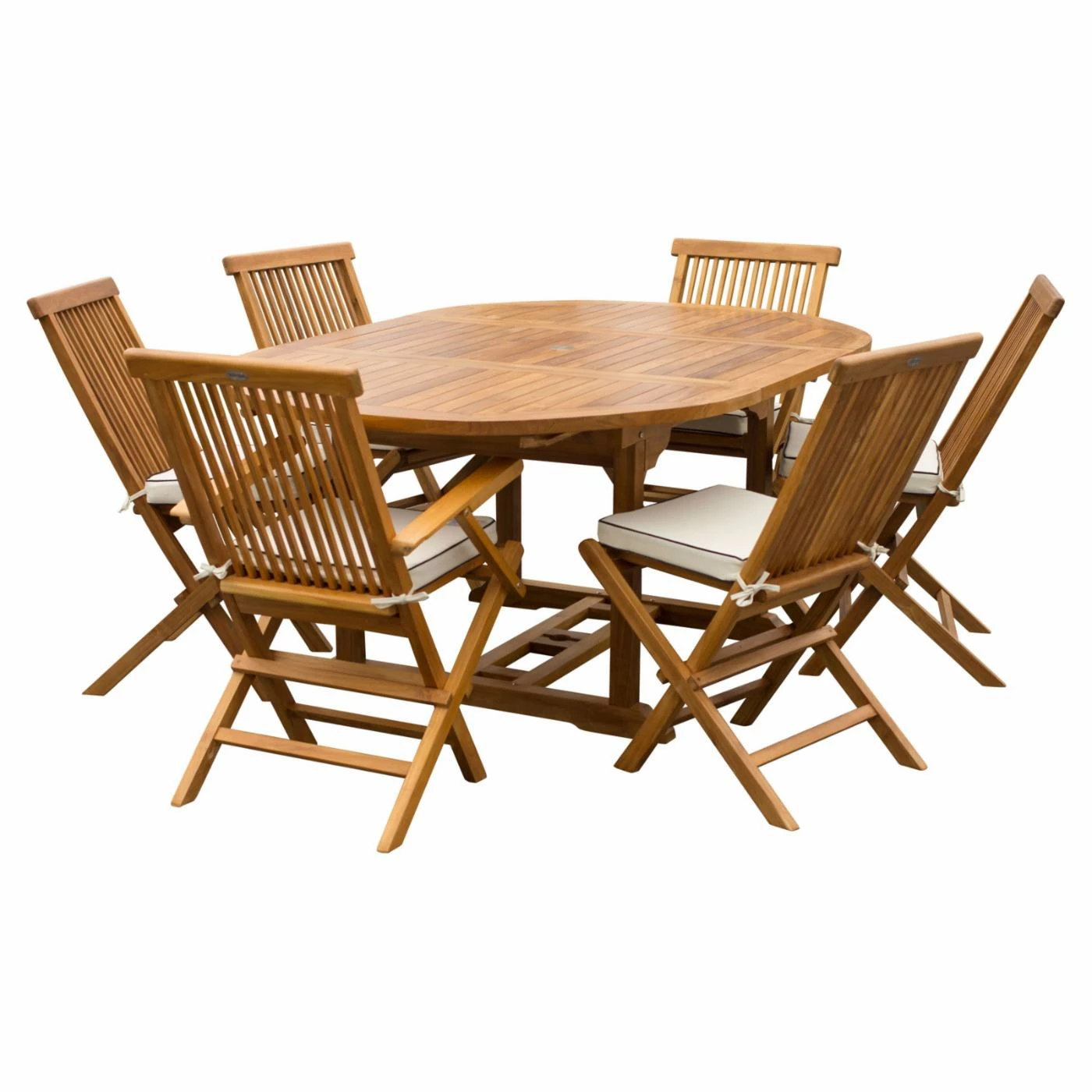 Affect a casual coastal appeal to your deck with the Seven Seas Teak Lauderdale Teak 7 Piece Patio Dining Set. This set includes an oval dining table and six matching chairs. Solid teak hardwood constructs the frames, naturally resistant to warp and rot. Stainless-steel hardware and a honey brown finish provide endless durability. Each chair has a slatted, angled back and comes with a foam-padded seat cushion with waterproof Sunbrella fabric.