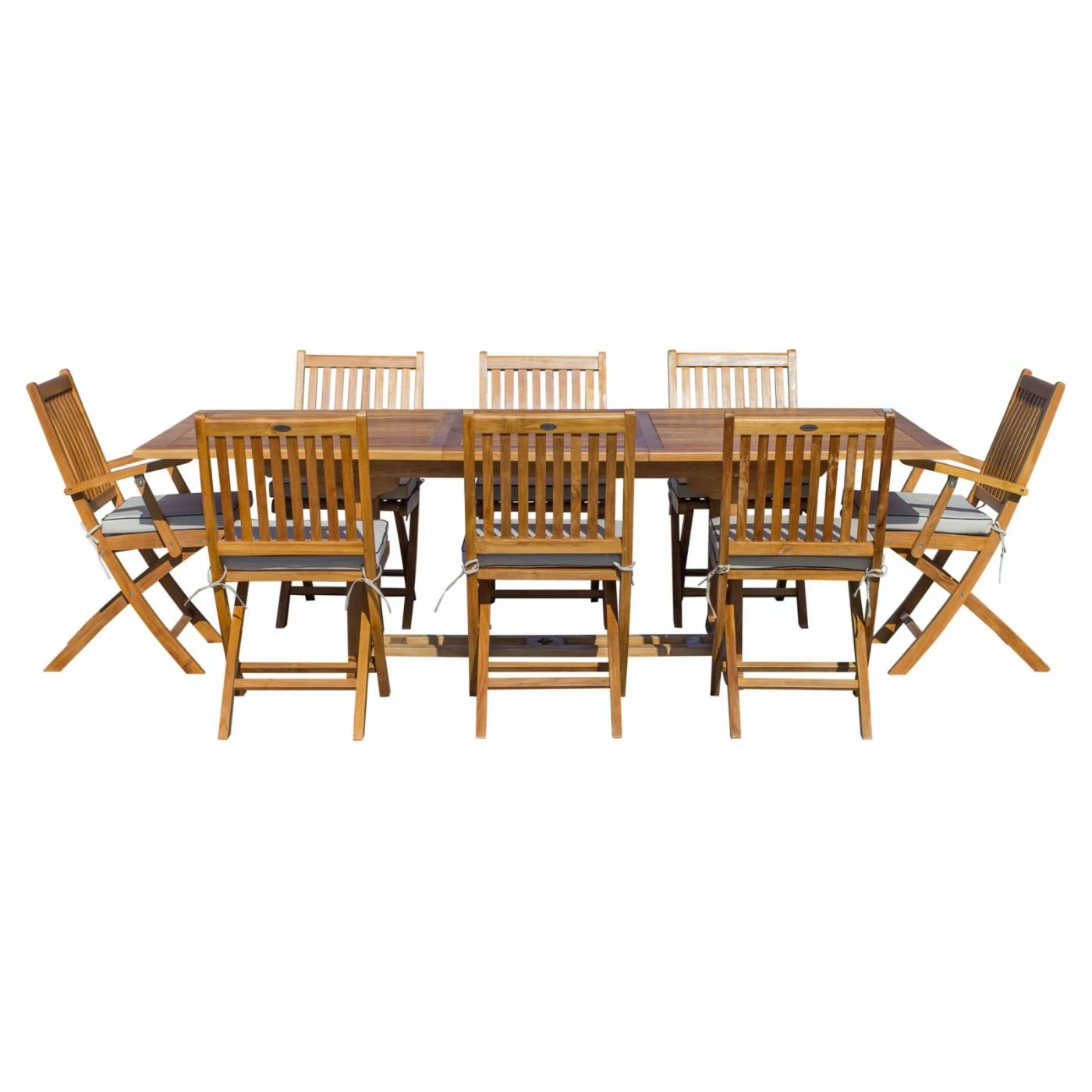Ensure all your family and friends have a seat at the table with the Seven Seas Teak Santa Monica Teak 9 Piece Rectangle Patio Dining Set. This outdoor dining set has a wide, rectangular table and eight matching chairs. Solid teak hardwood constructs the frames, secured with stainless-steel hardware and finished in honey brown. Tall-slatted backs provide support while the foam-padded, waterproof Sunbrella seat cushions lend lasting comfort.