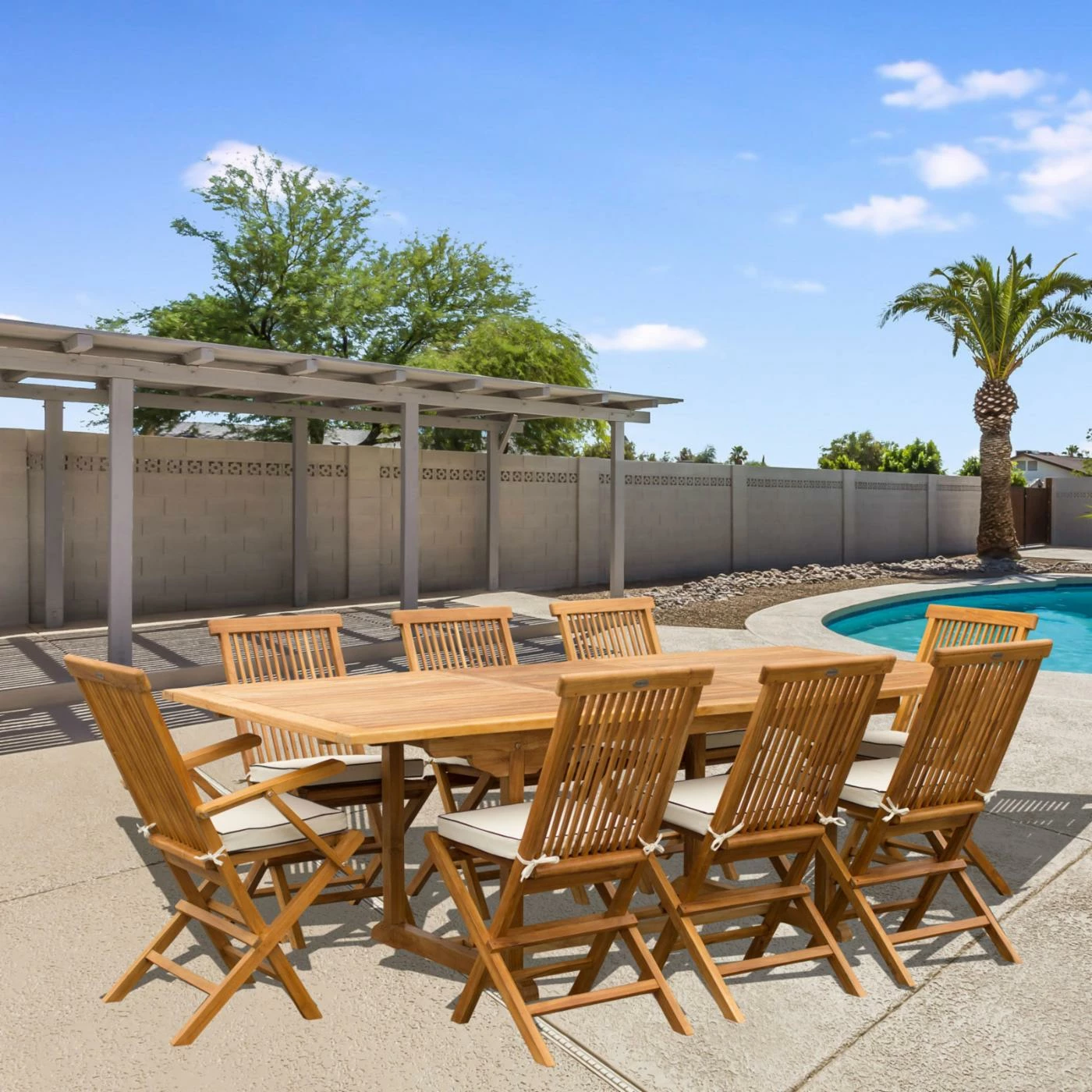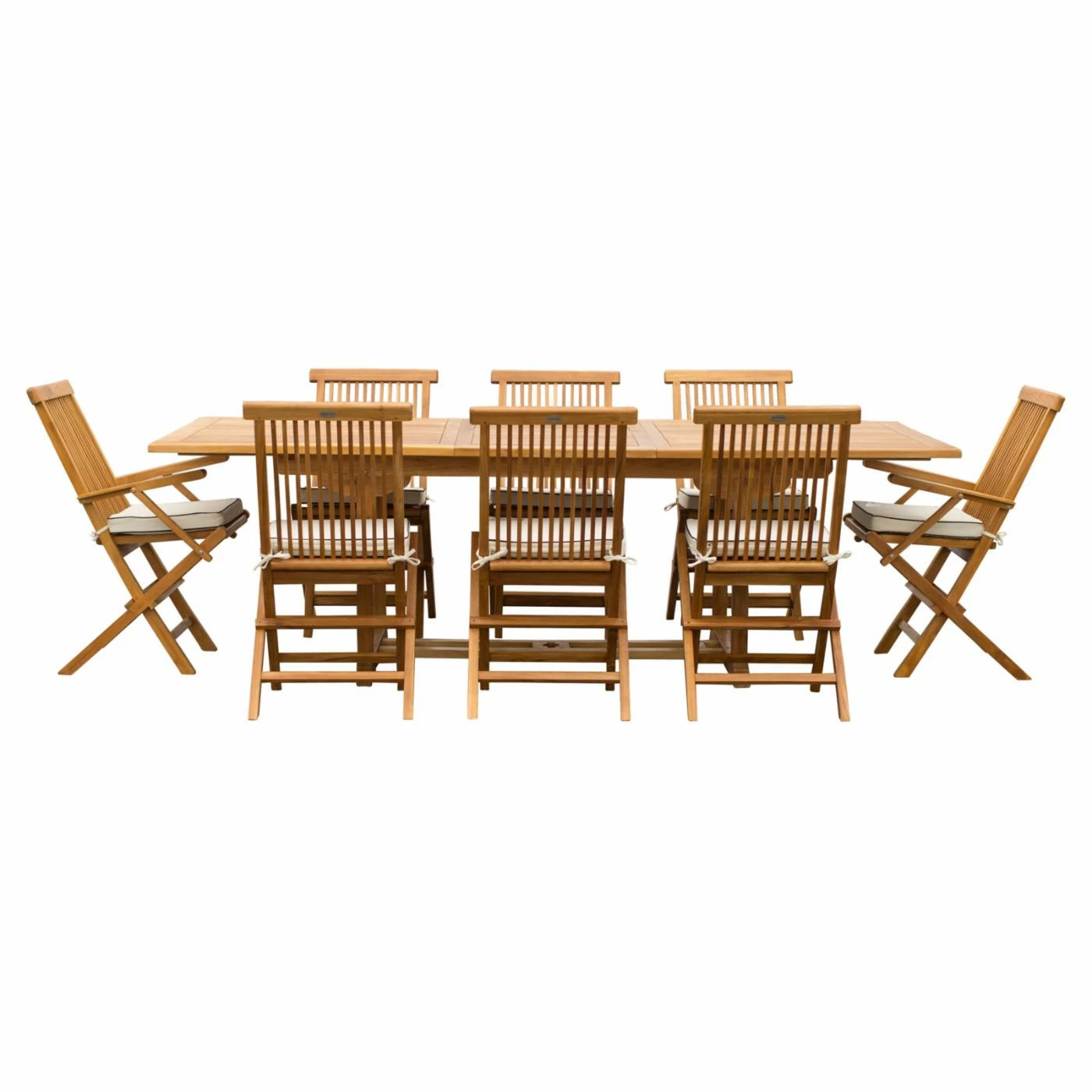 Offer your patio plentiful seating space for your all your pool-parties, barbecues, and more with the Seven Seas Teak West Palm Teak 9 Piece Rectangle Patio Dining Set. This spacious rectangular table comes with eight matching chairs, all built from solid teak and stainless steel. A honey brown finish keeps the set safe from weather-damage. Each chair has an angled, slatted back and an all-weather, foam-padded Sunbrella seat cushion.