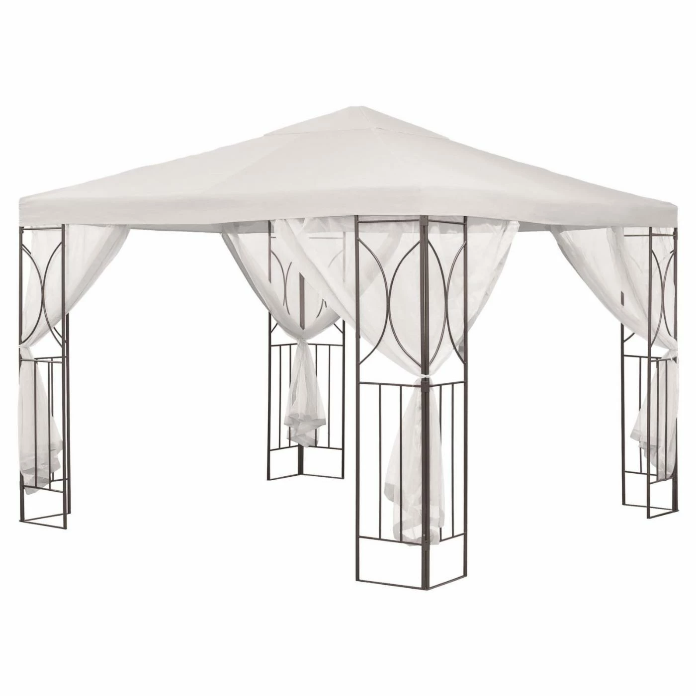 The Transcontinental Outdoor Polenza 8 x 8 ft. Gazebo Canopy features an elegantly designed frame with ornate posts and a cream polyester top with vented peek and white net curtains that can fasten and draw together for your privacy.
