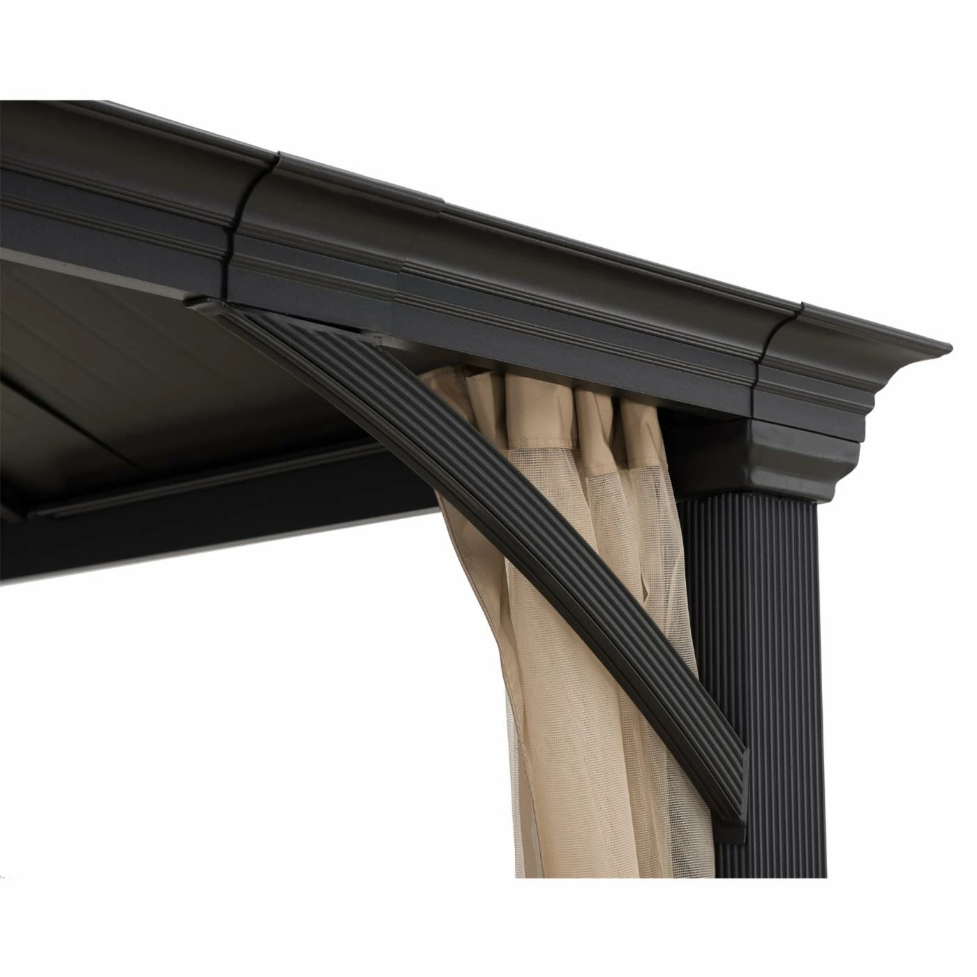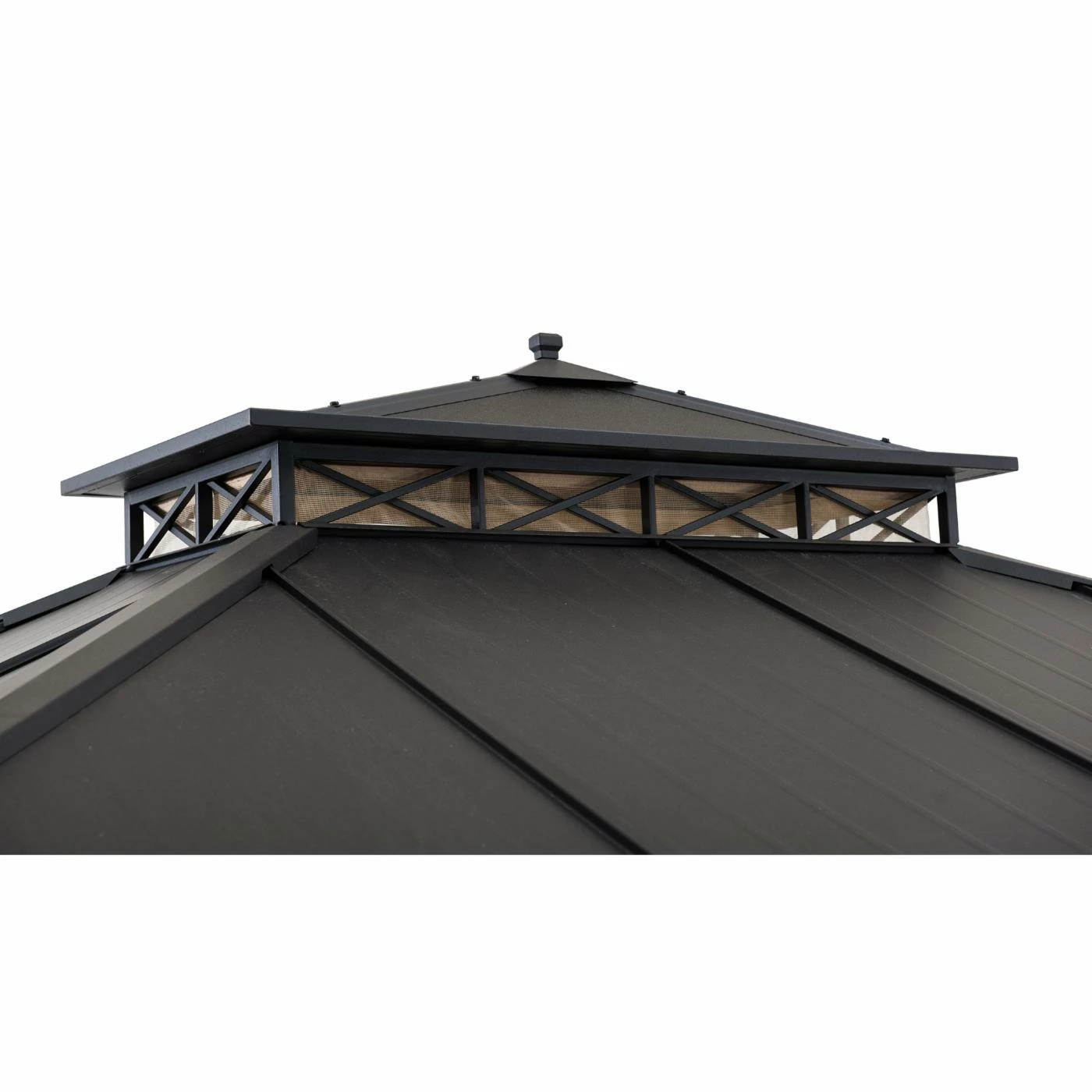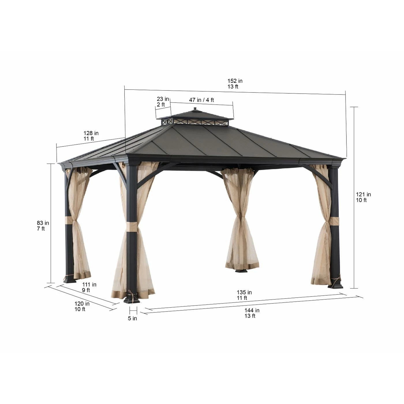 Instantly create an outdoor gathering spot for family and friends away from the glaring sun and pesky insects with the Sunjoy Cross Hip 10.5 x 12.5 ft. 2 Tier Hardtop Steel Gazebo. This 10.5 ft. x 12.5 ft. 2-tier, vented hardtop gazebo by the world’s leading ready-to-assemble outdoor structure maker, Sunjoy, creates the perfect outdoor setting for any time of the year. The 2-tier roof provides just the right amount of airflow while keeping occasional inclement weather at bay. Keep cool in the shade under the powder-coated steel structure. Use the mesh netting to keep mosquitoes and other bugs from joining your group. Set the mood by suspending a chandelier from the incorporated ceiling hook for functional light and high design. With straight-forward, easy-to-follow assembly instructions you’ll be relaxing in your favorite new outdoor living space for years to come.