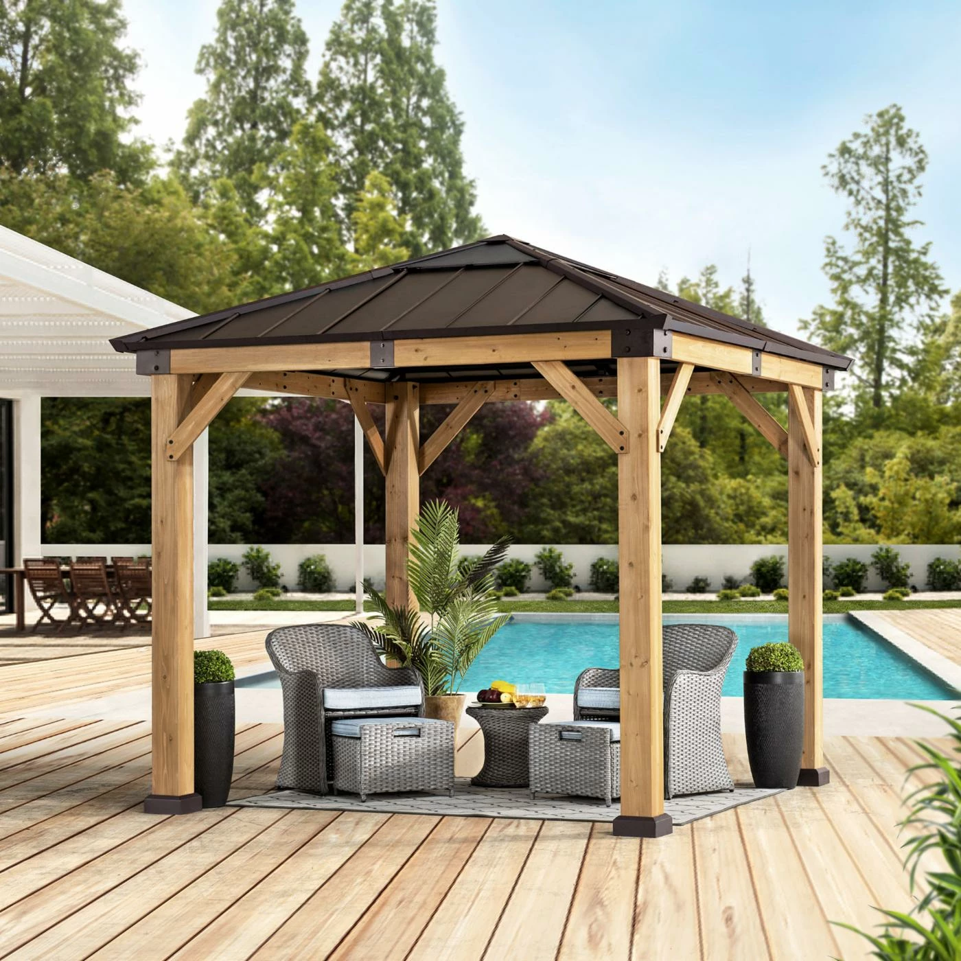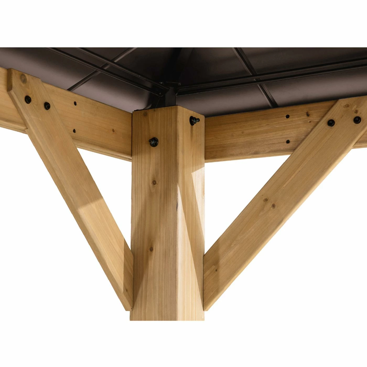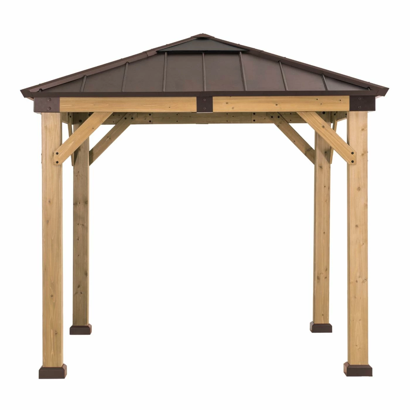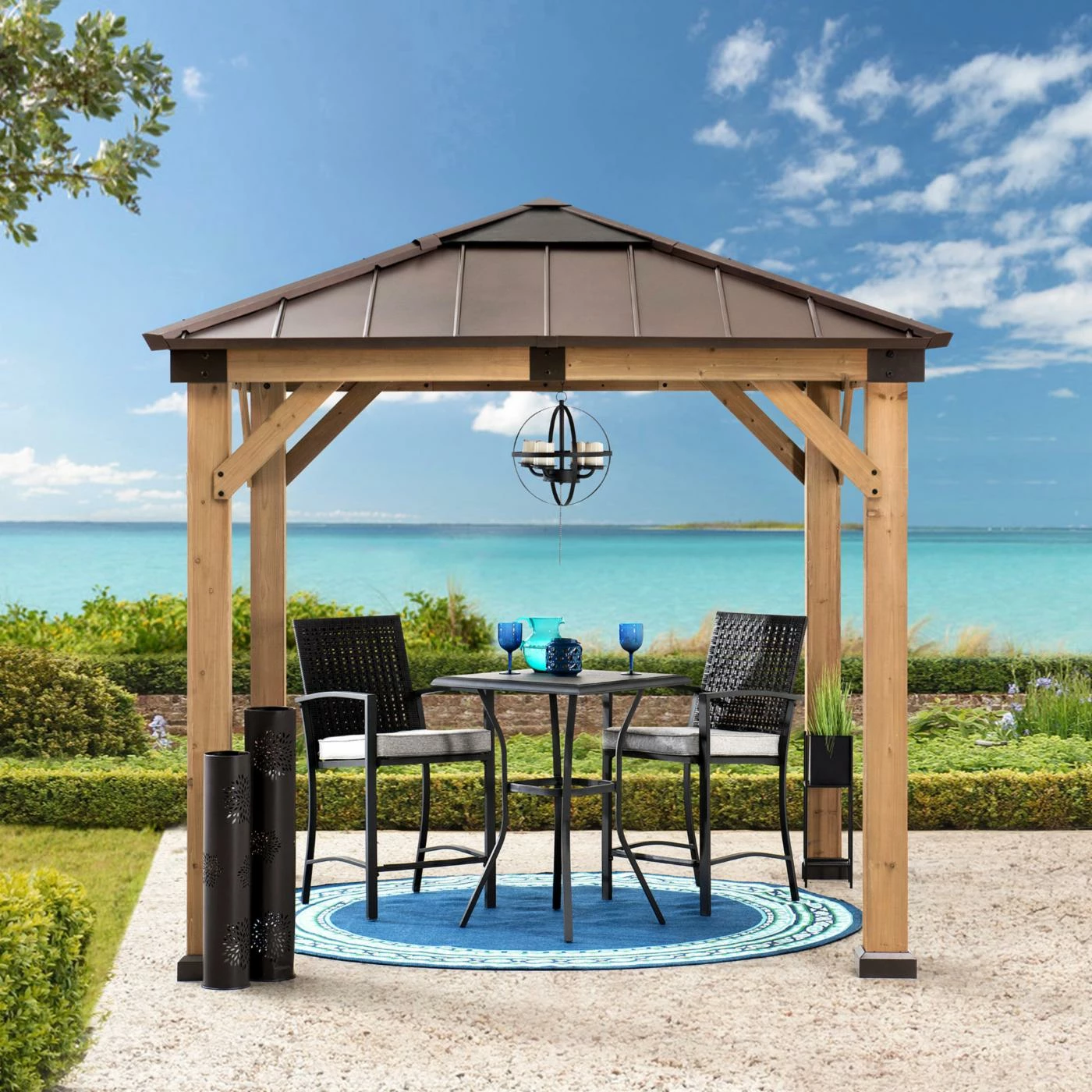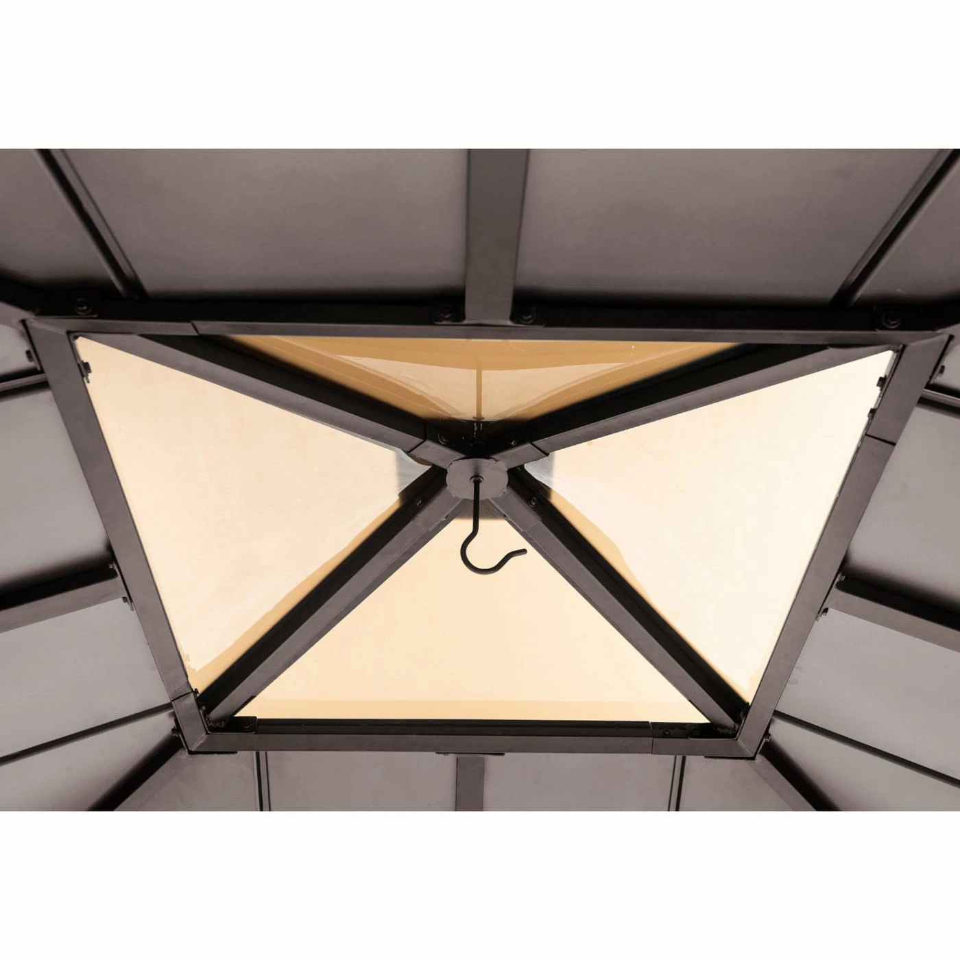 Add the Sunjoy Hip 9 x 9 ft. Polycarbonate Hardtop Cedar Framed Gazebo to expand your living space by bringing the indoors outside and creating your end-of-the-day oasis thatโs the perfect spot for entertaining family and friends. This 9 ft. x 9 ft. gazebo by the worldโs leading ready-to-assemble outdoor structure maker, Sunjoy, creates the perfect outdoor setting for any time of the year. Spend all four seasons enjoying a covered spot outdoors under the Cedar wood frame with a sturdy powder-coated steel and polycarbonate roof top that will stand the test of time. The polycarbonate skylight provides needed shade on hot sunny days while allowing in natural light. Set the mood by suspending a chandelier from the incorporated ceiling hook for additional functional light and high design. With straight-forward, easy-to-follow assembly instructions youโll be relaxing with your beverage of choice in your favorite new outdoor living space for years to come.